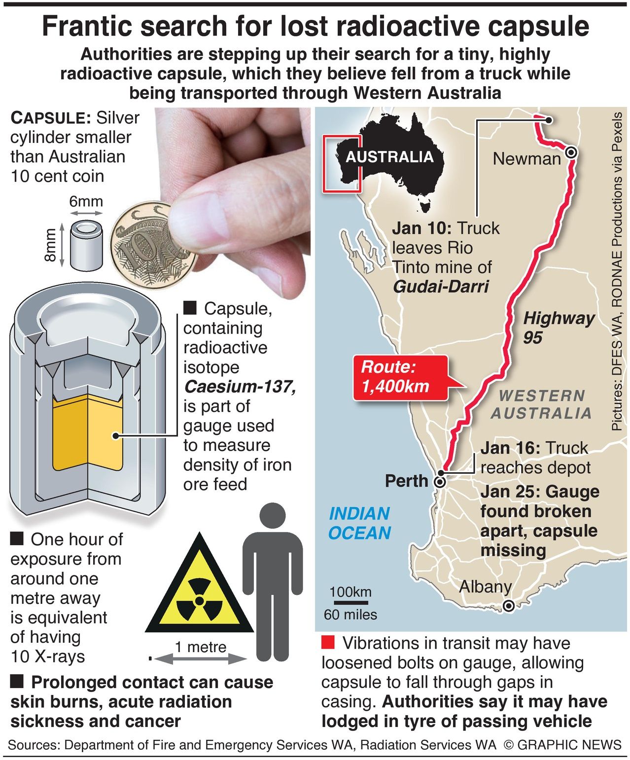 The silver capsule contains a small amount of caesium-137, and is dangerously radioactive. An hour of exposure from about a metre away is the equivalent of having 10 X-rays, and prolonged contact can cause skin burns, acute radiation sickness and cancer, experts said.