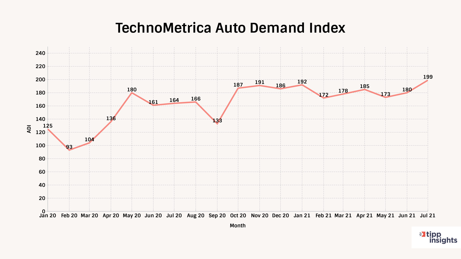 The TechnoMetrica Auto Demand Index (ADI) rose 19-points, or 10.3 percent, to 199 in July – the index's all-time high since we began tracking in February 2007.