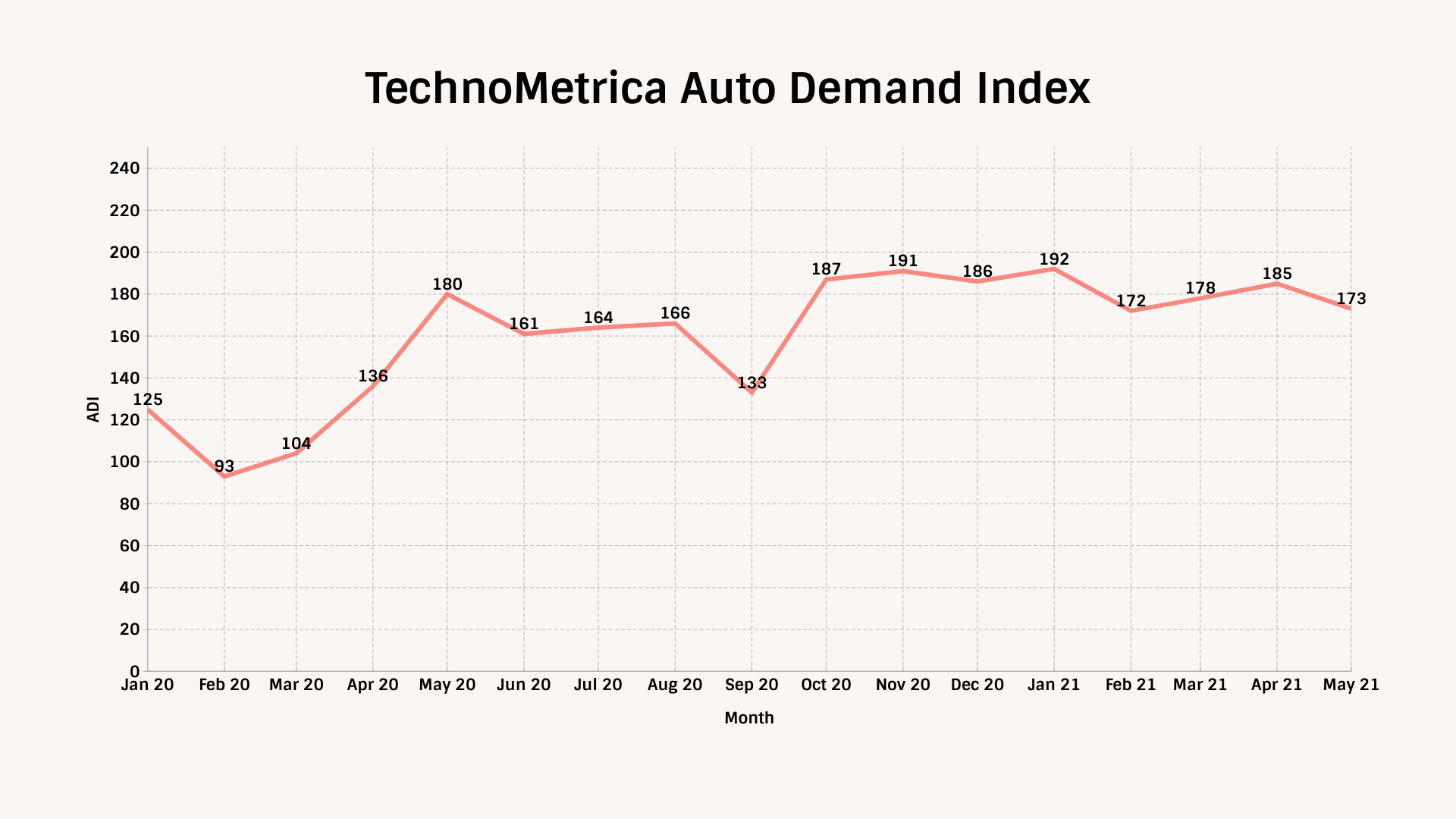 The TechnoMetrica Auto Demand Index (ADI) declined by 12-points, or 6.5 percent, to 173 in May. The average ADI since the onset of COVID has been 167, compared to 173 this month.