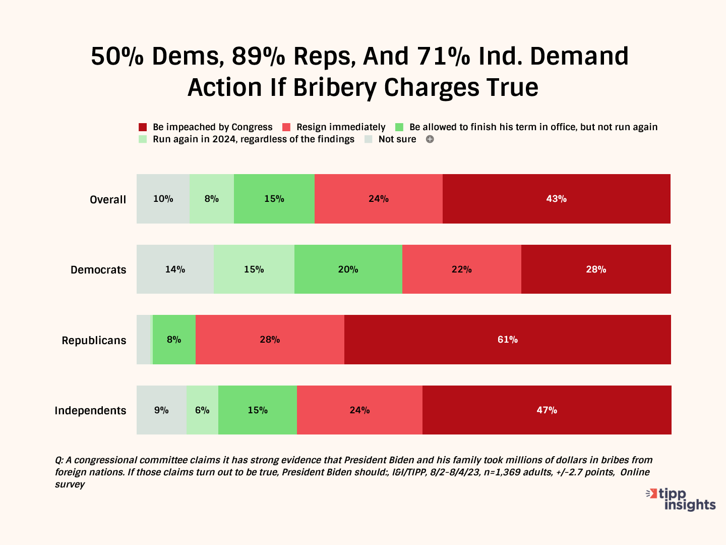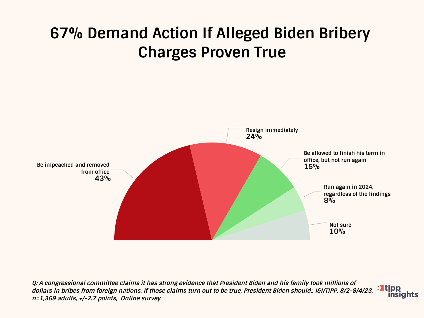 In a recent I&I/TIPP Poll, nearly two-thirds of Americans want action if it can be shown that President Biden and his family took bribes from foreign nations. Most Americans will support impeachment if the inquiry reveals solid evidence of high crimes and misdemeanors by the President. To save themselves, as politicians always do, Democrat Senators up for reelection would throw Biden under the bus rather than be thrown out of office in the 2024 election.