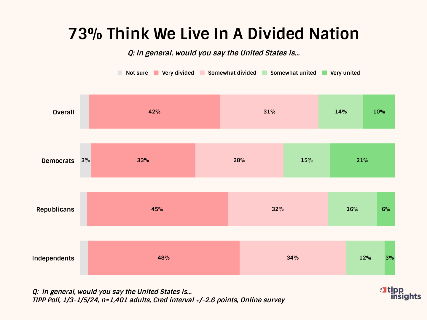 73% say the nation is divided. Notice the intensity of the response in the chart. Nearly one-half (42%) believe the country is very divided, and another 31% think it is somewhat divided.