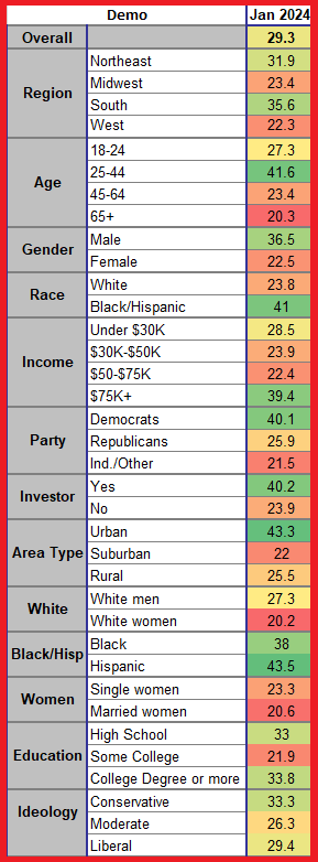 In January, all 36 demographic groups we track are below 50.0 and believe we live in a divided country.