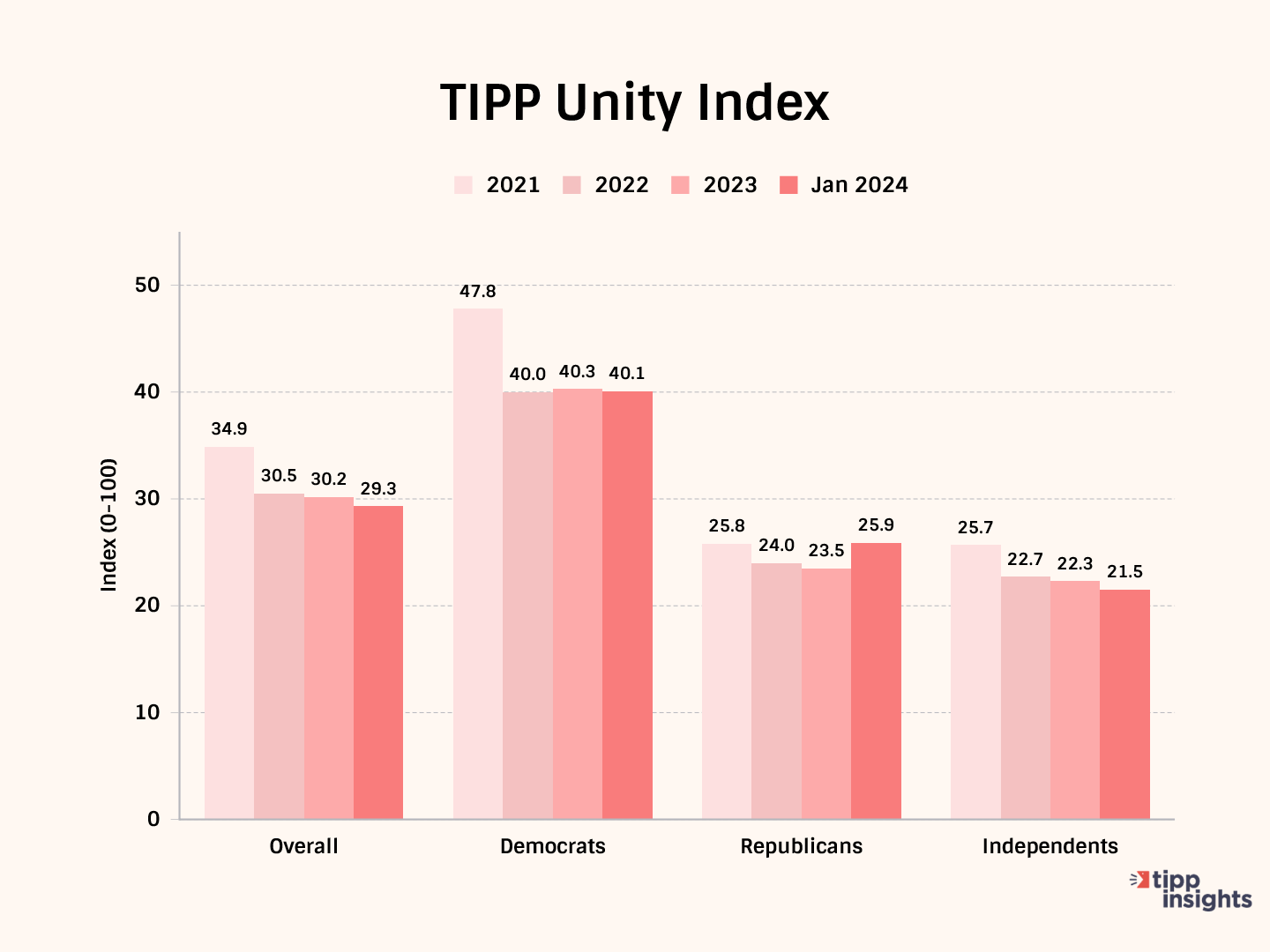 The chart below shows the unity index by year. Notice that the overall index has deteriorated during the Biden presidency: