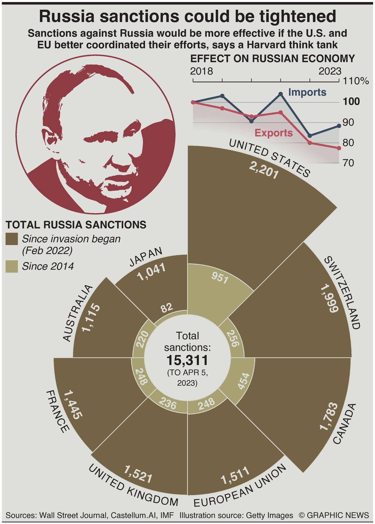 Sanctions against Russia would be more effective if the U.S. and EU better coordinated their efforts, says a Harvard think tank.