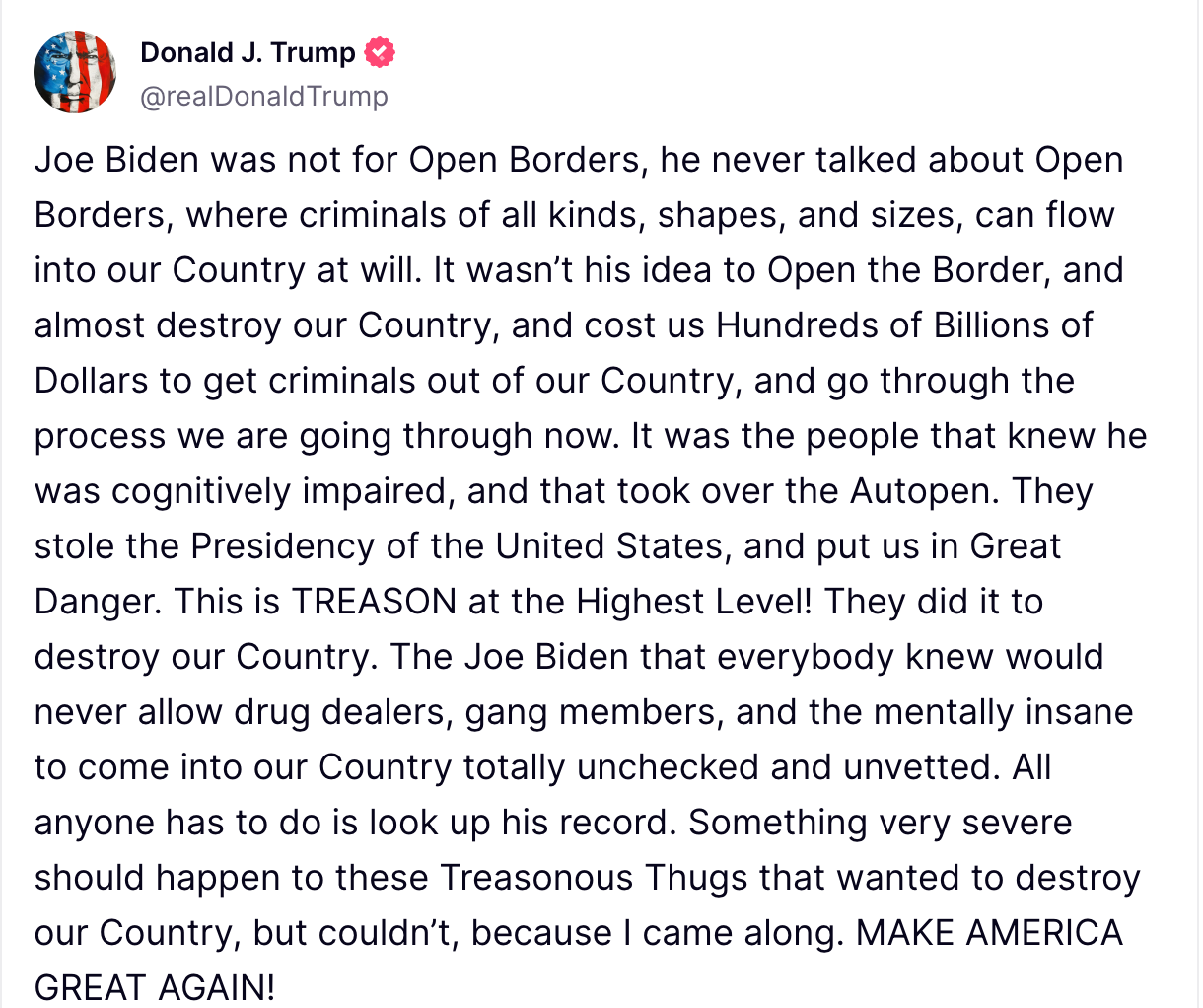 President Donald Trump accused former President Joe Biden’s White House team of treason, claiming they exploited Biden’s cognitive decline to enact policies he never supported, including opening the southern border. In a Truth Social post Tuesday, Trump alleged Biden’s aides hijacked the presidency using an autopen to approve border policies that have allowed criminals to enter the U.S.
