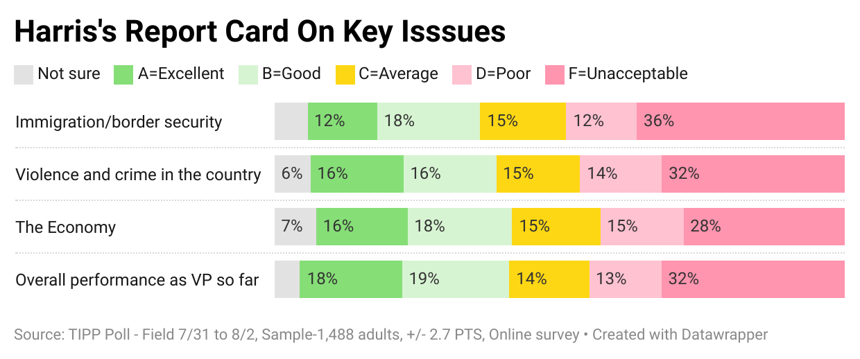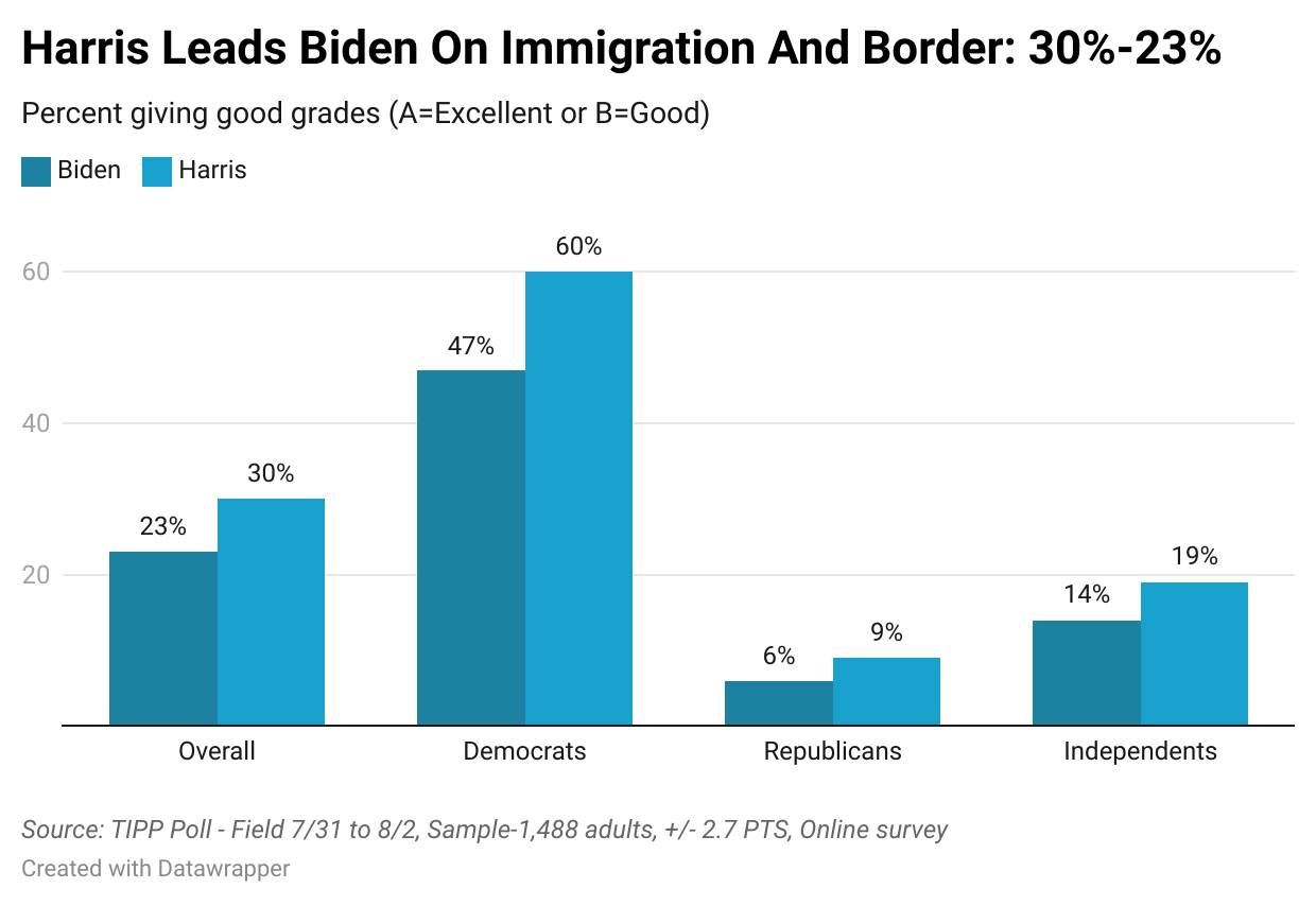 The media is debating whether Biden assigned her the responsibility of managing the border as the border czar, possibly with the ulterior motive of distancing her candidacy from the border situation. However, the data shows that this debate is moot since only a small share of Americans give both Biden (23%) and Harris (30%) good grades.
