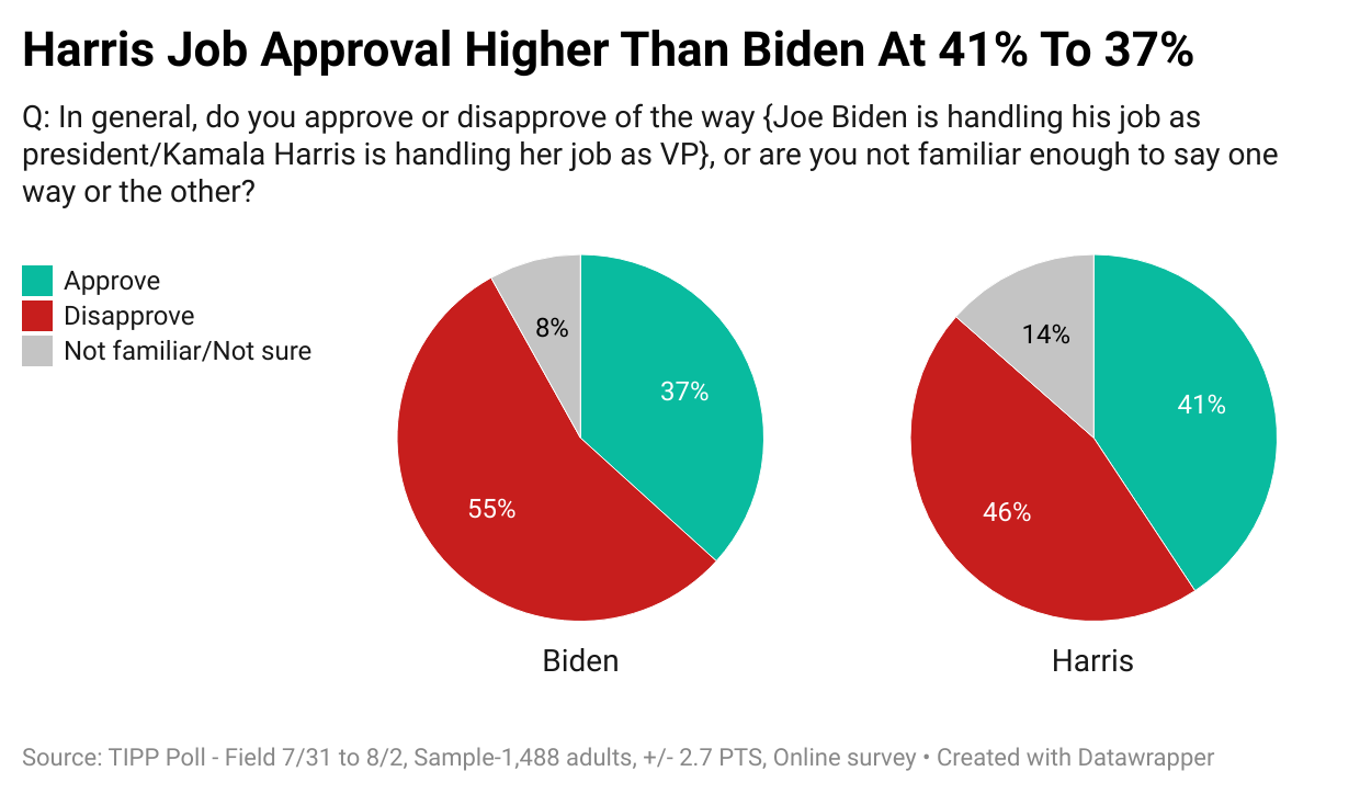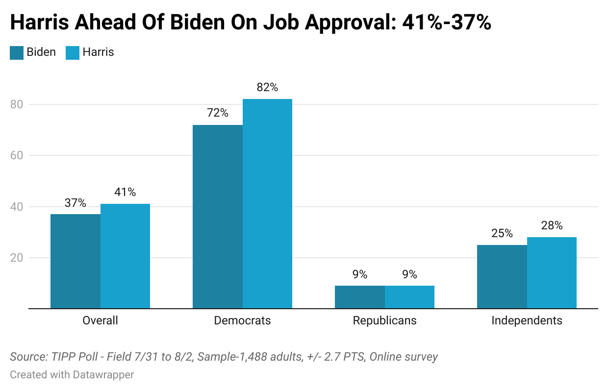 Regarding job approval, Harris’s job approval as the VP is 41% compared to Biden's 37%, resulting in a net approval of -5 points for Harris, a significant difference from Biden’s -18 points.