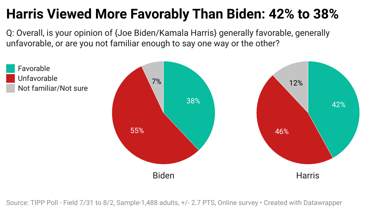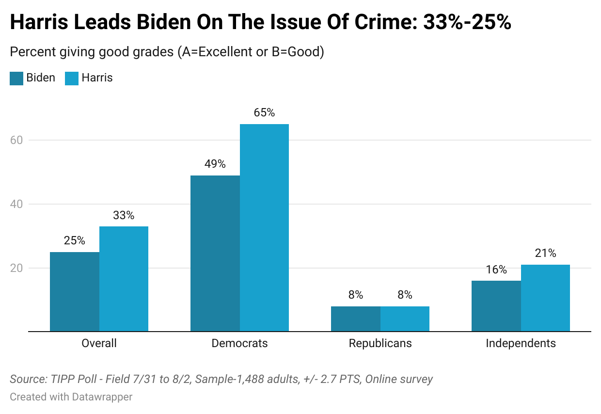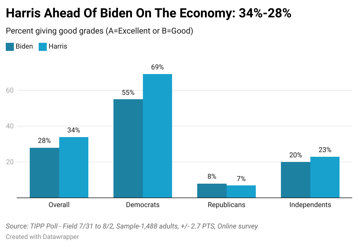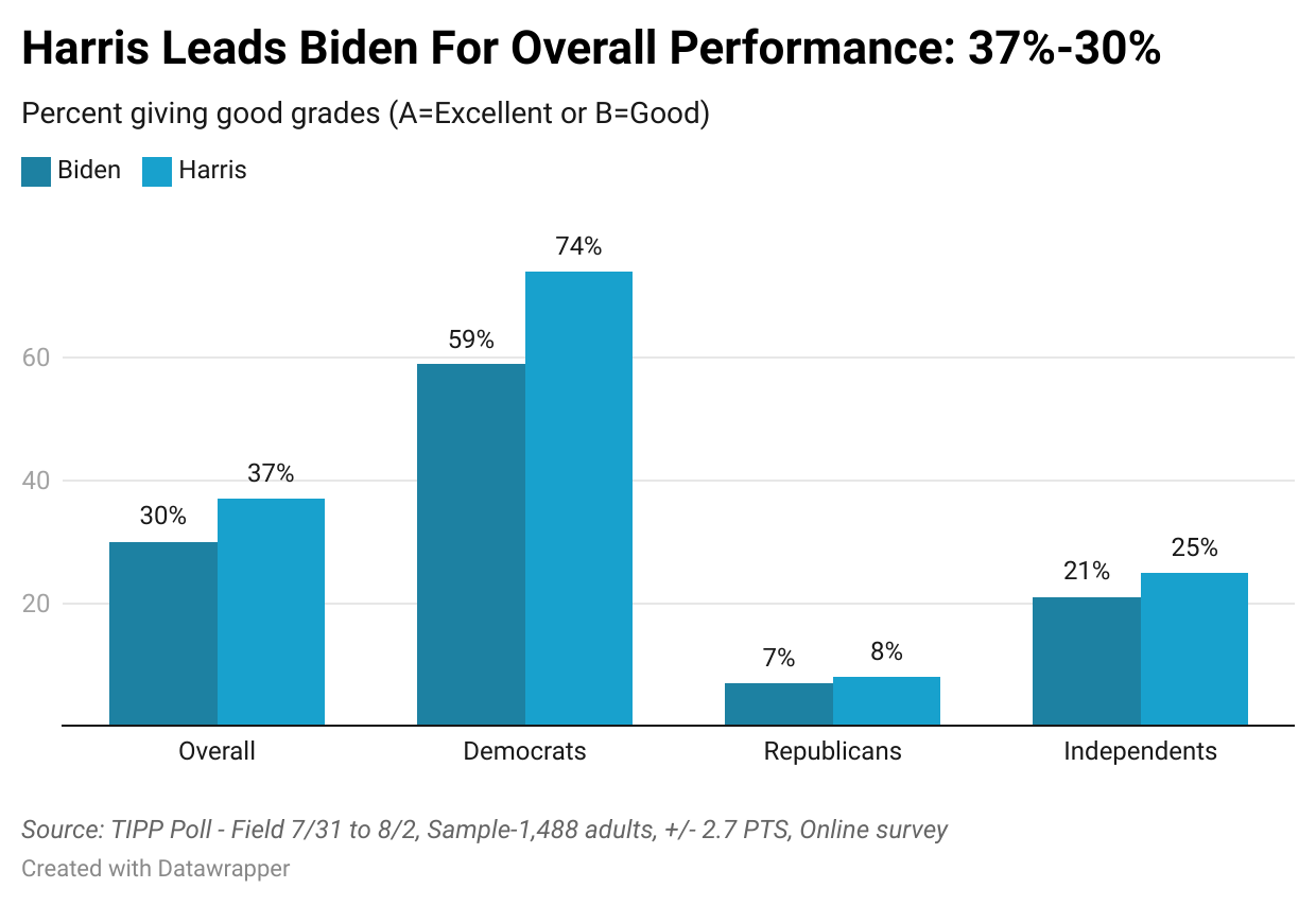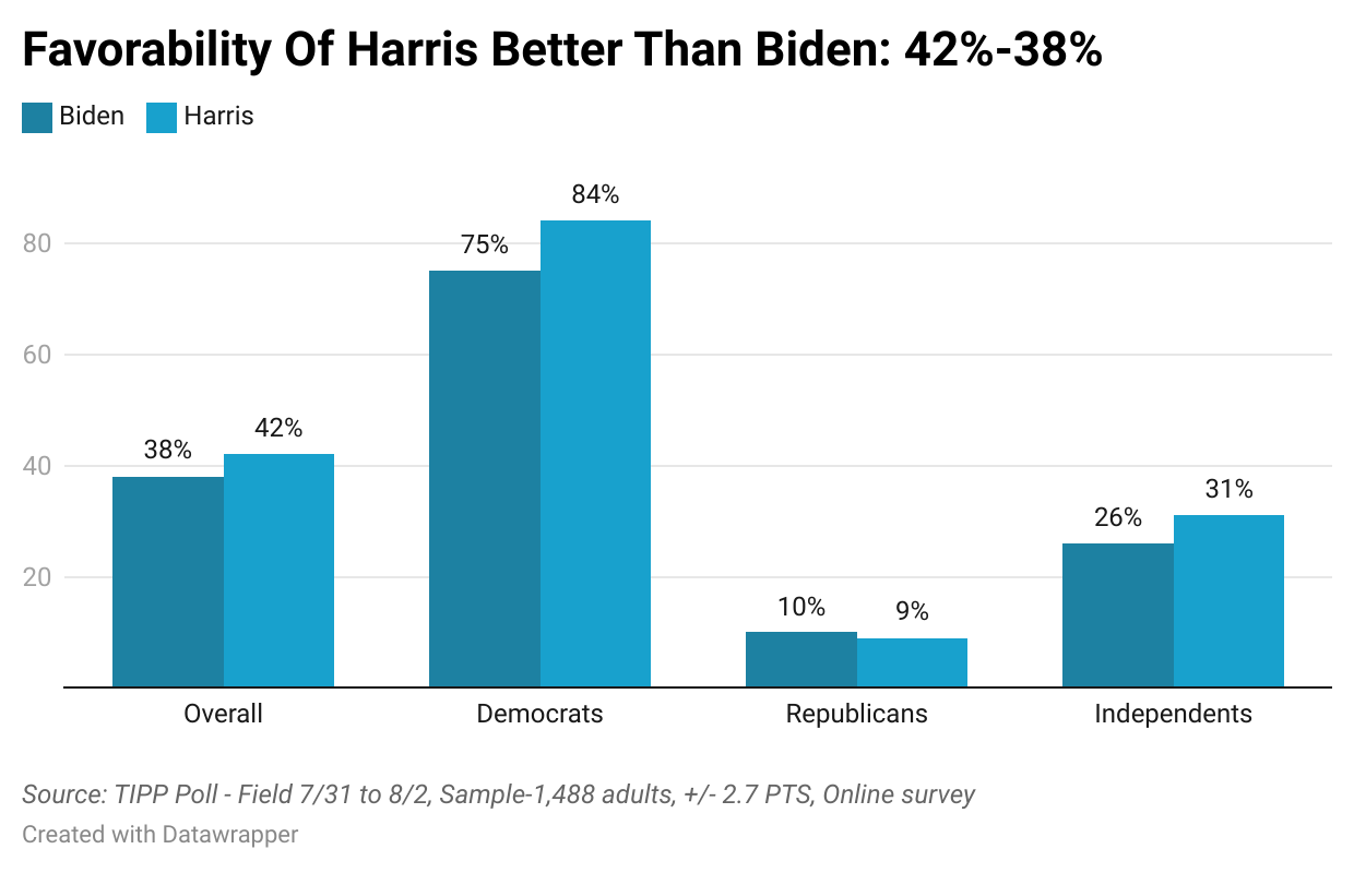 Can Kamala Harris's rising favorability among Democrats translate into broader electoral success? According to the latest TIPP Poll of 1,488 Americans completed last Friday, Harris outshines President Biden on all key election issues. However, this advantage is limited to Democrats, as independents remain unconvinced.