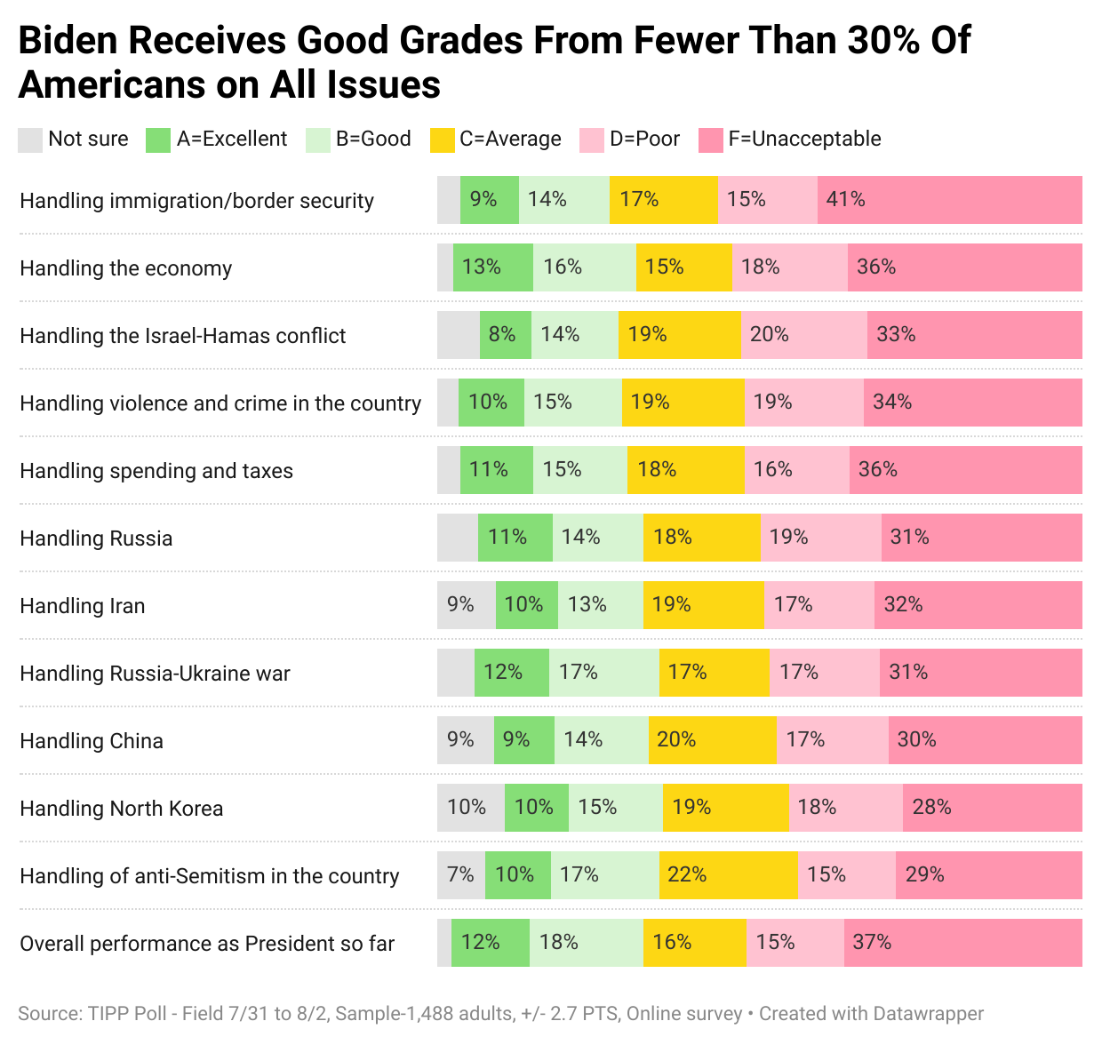 - Biden gets good grades (A or B) from fewer than 30% on all issues.