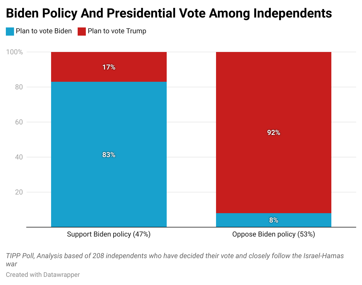 But within the all-important “independent” demographic, we analyzed those who have decided their vote and are following the Israel-Hamas war story. In this group of 208 independents in our survey sample, a solid majority—53 %—opposes the White House decision, while 47% support it. Further, of those who support Biden's policy, 83% plan to vote for him and 17% for Trump. In contrast, 92% of those who oppose Biden's policy plan to vote for Trump, with only 8% voting for Biden. This indicates a statistically significant association between Biden's policy and voting decisions among independents, with Trump benefitting more among independent voters.