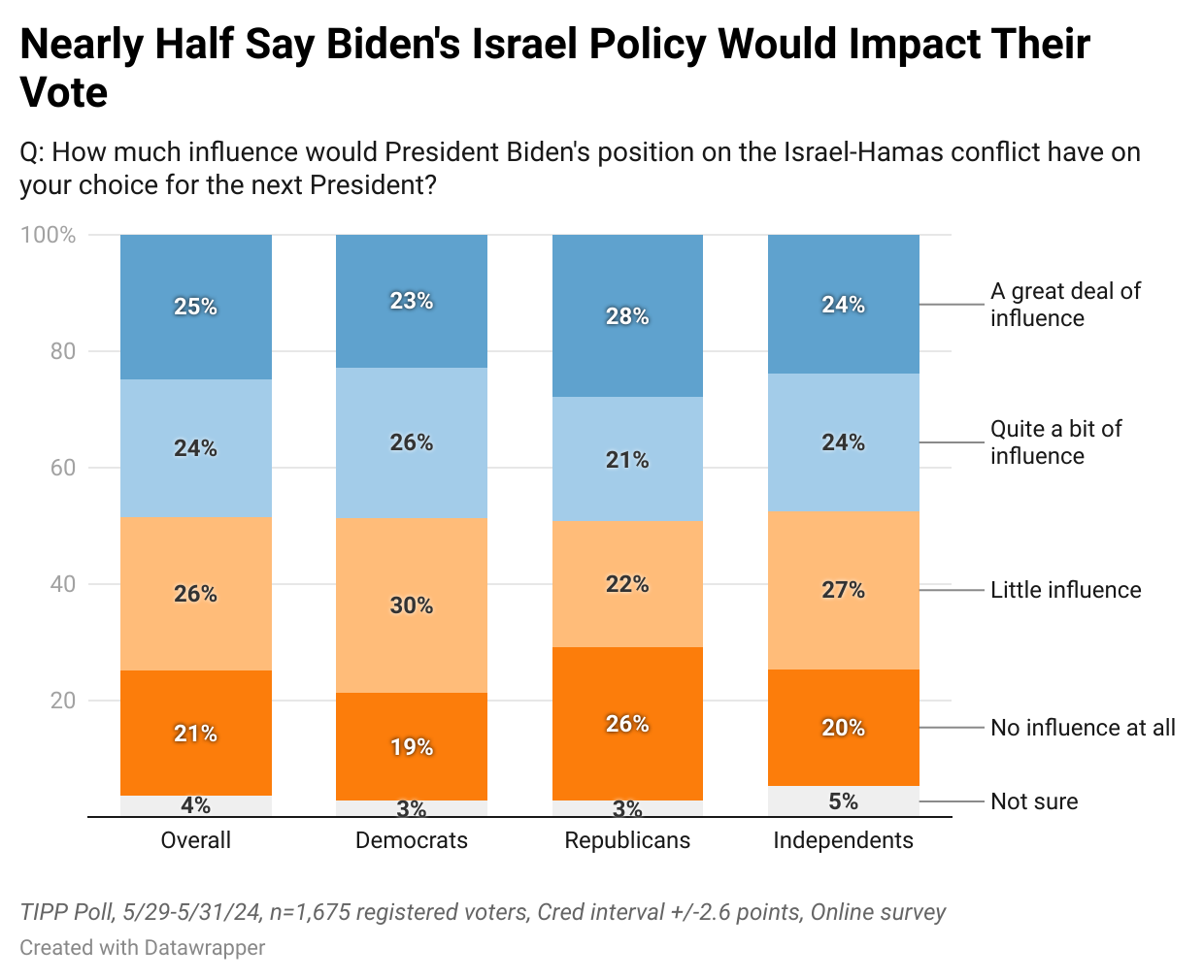 A recent TIPP poll reveals a strong association between opinions on this issue and voting behavior. 49% say this issue will have a “great deal” or “quite a bit” of influence on their vote, and 75% say that it will have at least some influence.
