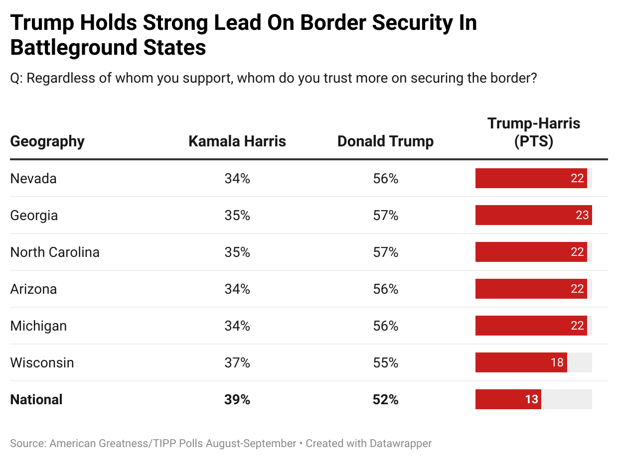 In recent TIPP polls conducted in battleground states, Trump has been leading Harris by 20 points on immigration, the second most important issue to American voters after the economy. With the new information, Trump's lead will only widen.