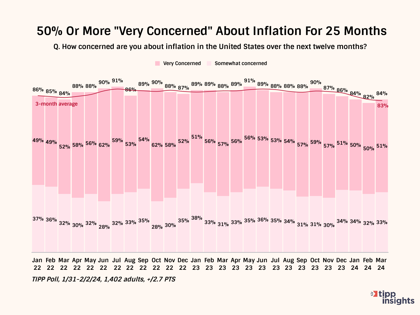 The latest TIPP Poll, completed earlier this month, shows over eight in ten (84%) survey respondents are concerned about inflation. Since January 2022, inflation concerns have stayed above 80%. The "very concerned" share has been at least 50% for twenty-four months.
