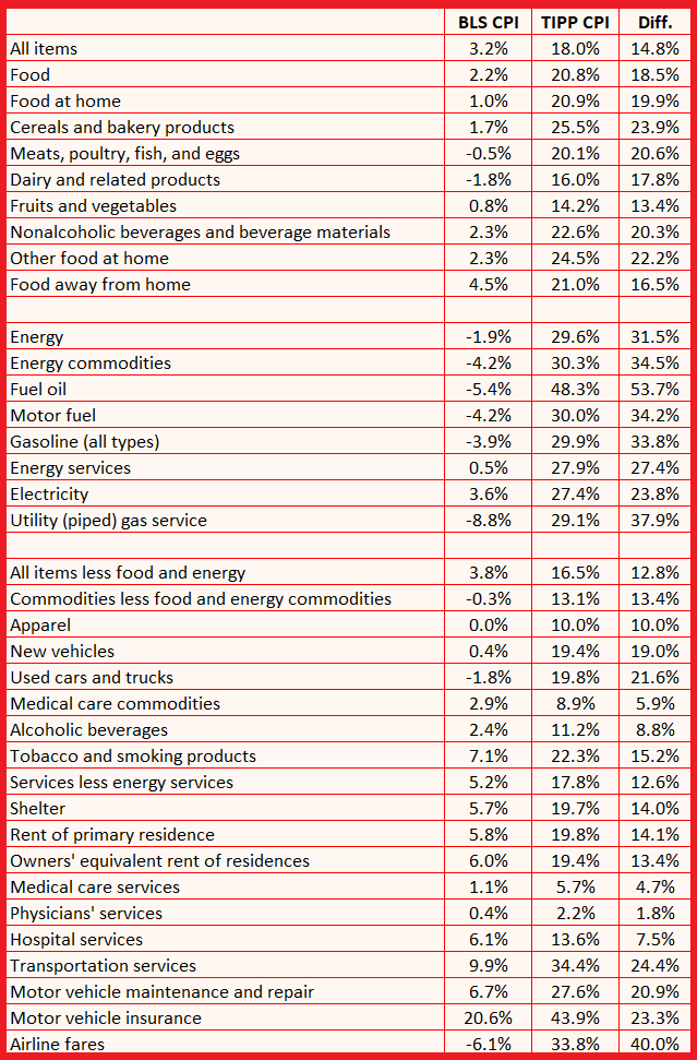 The Core CPI measures the price increase for all items, excluding food and energy. In the year-over-year measure, the Core TIPP CPI is 16.5% compared to 3.8% BLS CPI, a 12.8-point difference.