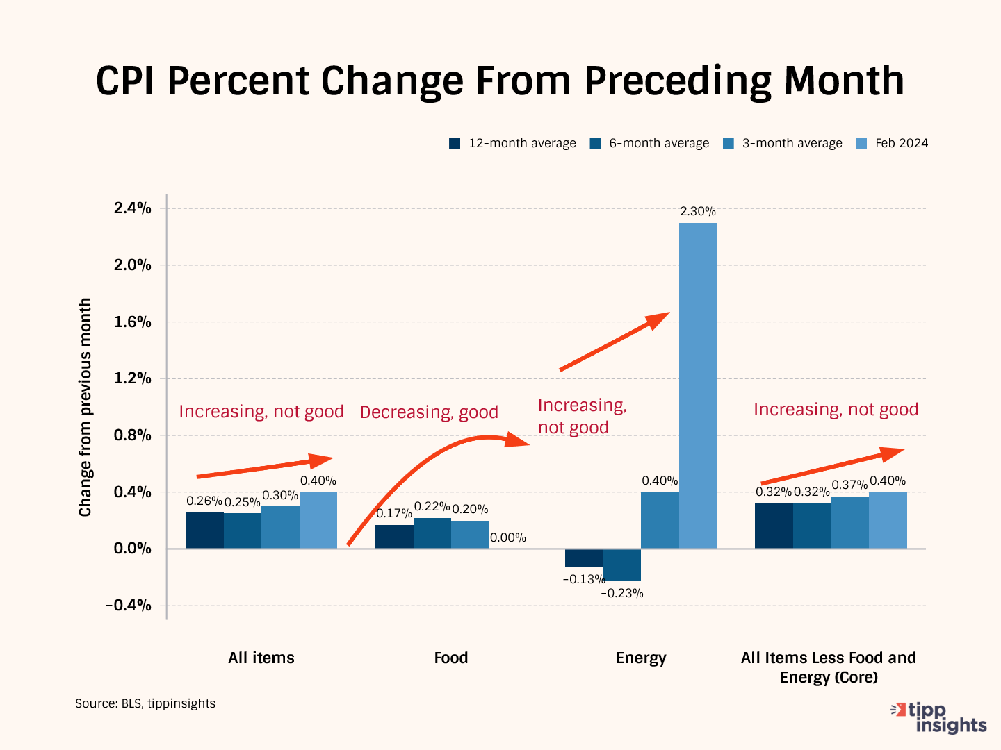 Typically, we compare the data from February 2024 to the three-month average to gain a clearer perspective. In February 2024, the price increase for All items was 0.40%, bigger than the three-month average of 0.30%. This shows a significant deterioration in February.