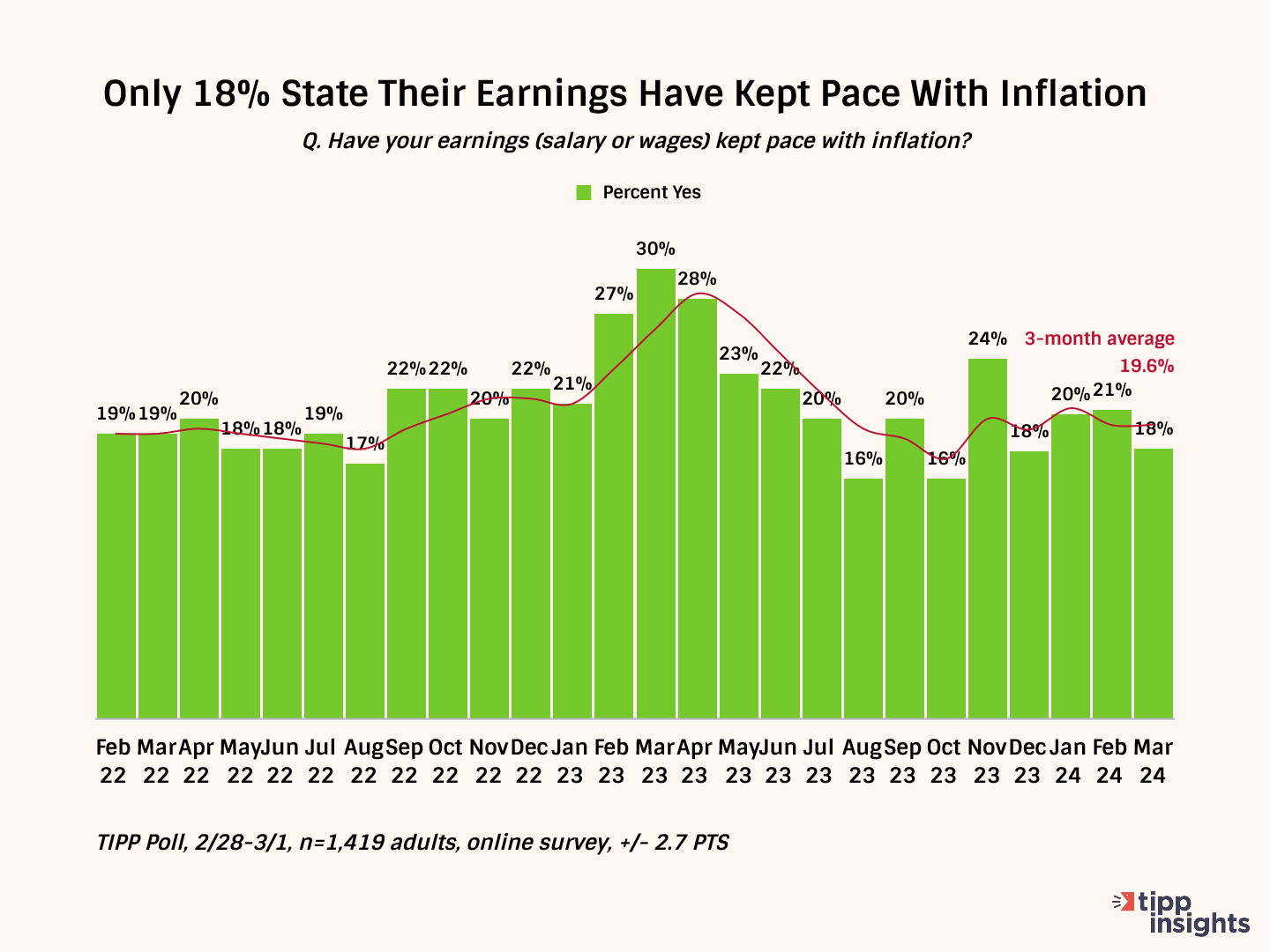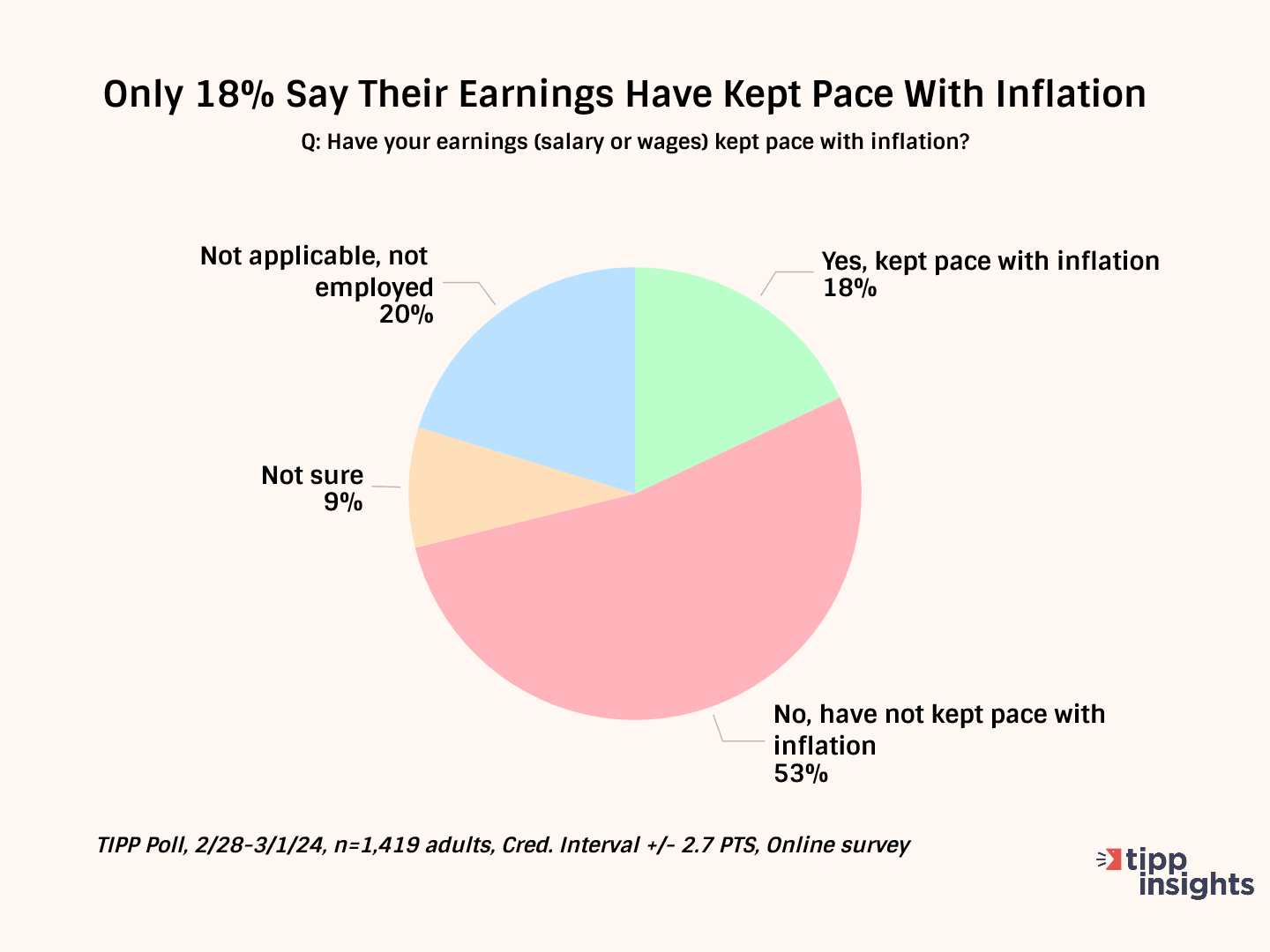 Over half (53%) say their wages have not kept up with inflation. Only one in five (18%) say their income has kept pace with inflation.