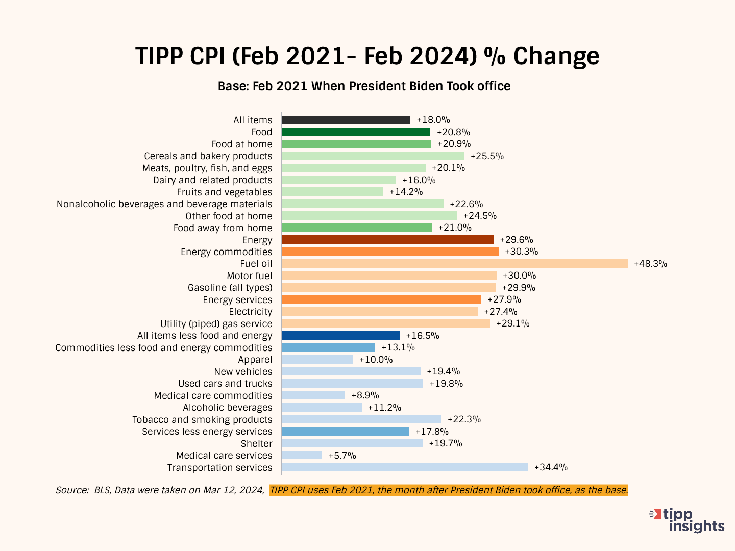 We developed the TIPP CPI, a metric that uses February 2021, the month after President Biden's inauguration, as its base to measure the rate of change. All TIPP CPI measures are anchored to the base month of February 2021, making it exclusive to the economy under President Biden's watch.