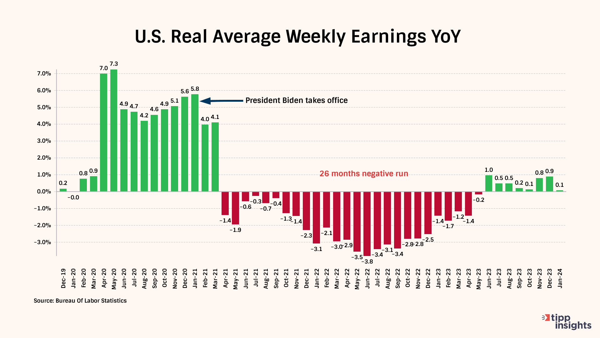 Real weekly wages, measured year-over-year, showed negative readings for 26 out of the 37 months during the Biden presidency from February 2021 to January 2024. The 26-month negative streak was broken in June. The measure posted positive readings for eight months between July 2023 and January 2024.