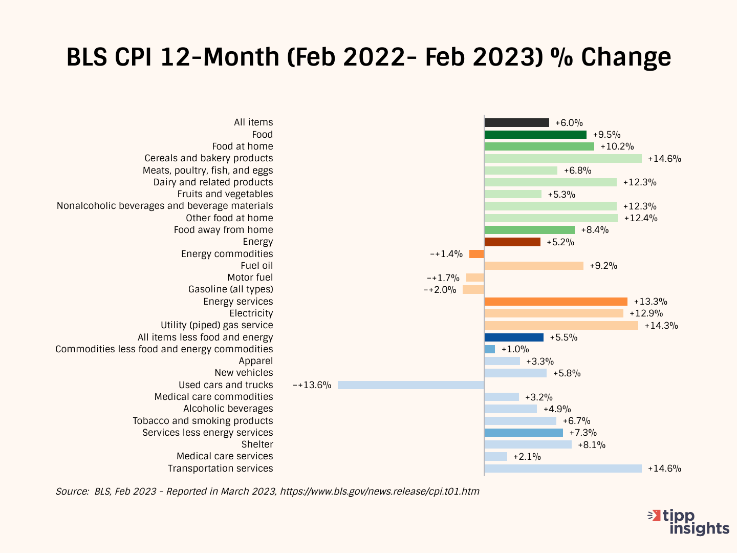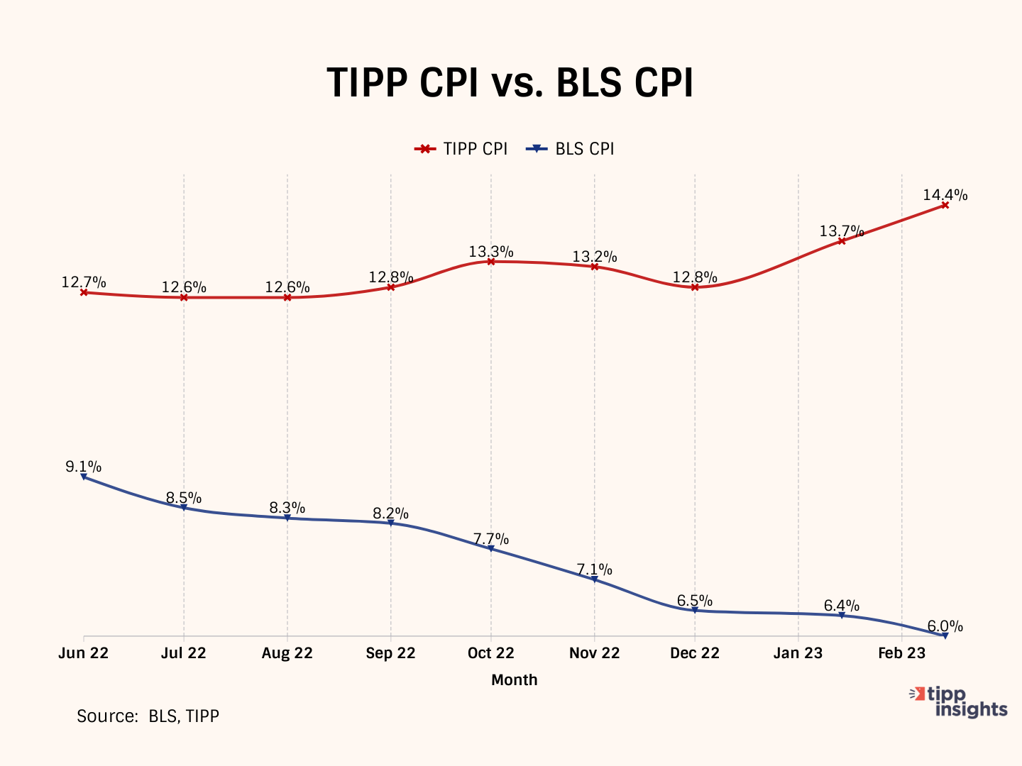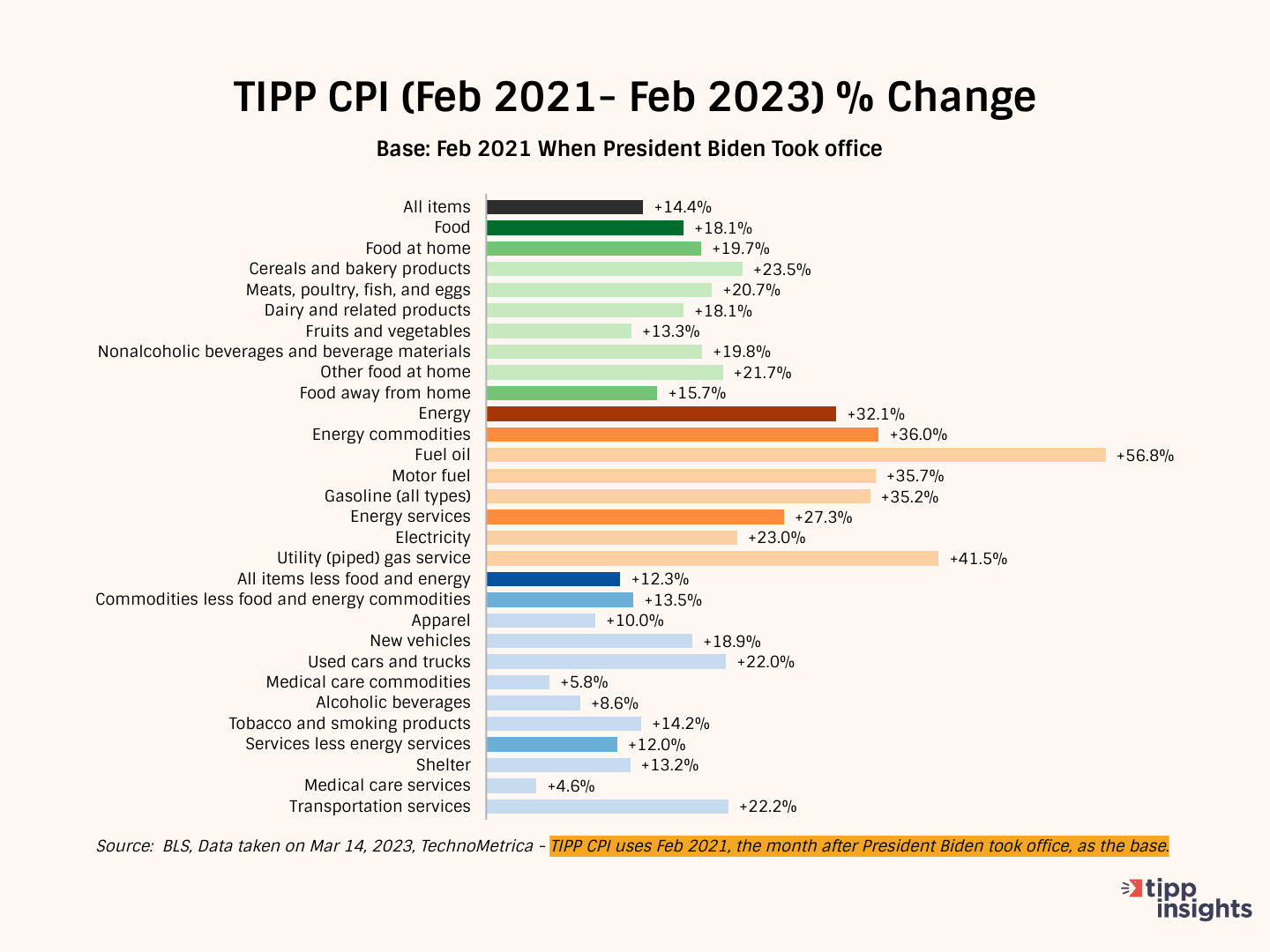 The annual CPI increase reported by BLS is 6.0% for February 2023. Compare this to the TIPP CPI of 14.4%, an 8.3-point difference. Prices have increased by 14.4% since President Biden took office.