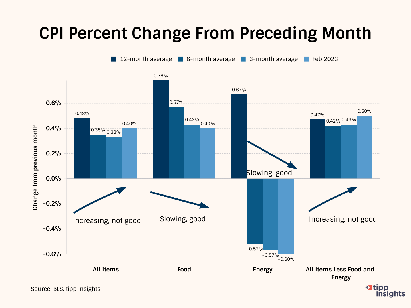 To better understand, compare the three-month average to February 2023 data. For “all items,” the three-month average was 0.33% vs. 0.4% in February 2023. It is increasing, and hence it is not good.