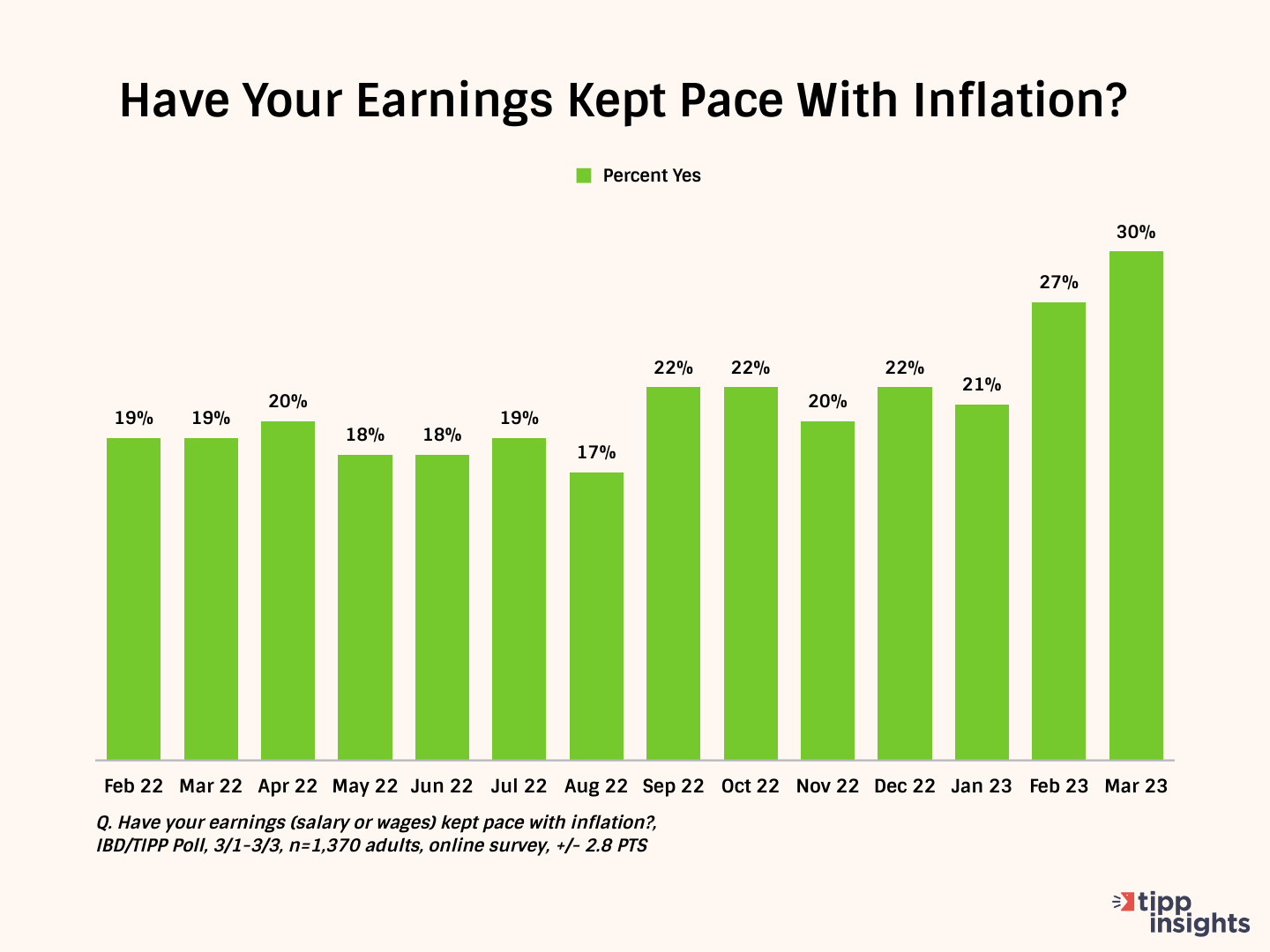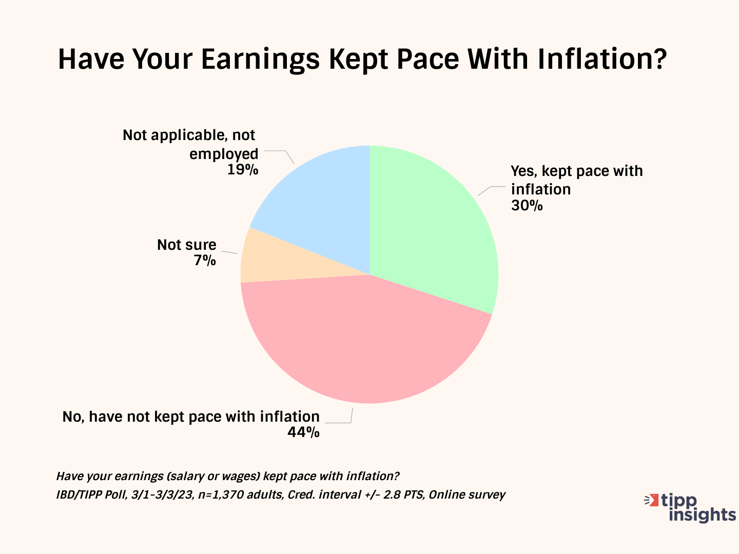Over two in five (44%) say their wages have not kept pace with inflation. Only 30% say their income has kept pace with inflation. This statistic hovered in the low twenties for most of the last year. The positive change in the recent two months may denote the start of a new trend.
