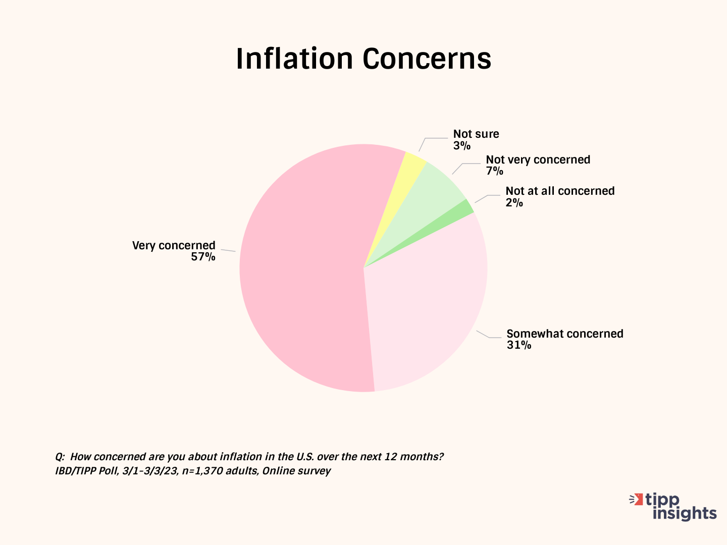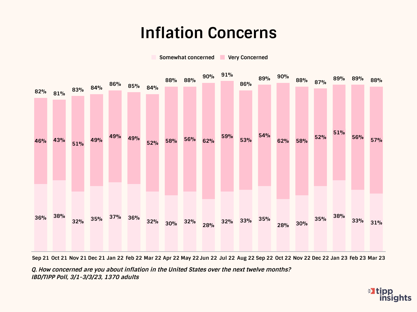 The latest Investor's Business Daily/TIPP Poll, completed earlier this month, shows that nine in ten (88%) of survey respondents are concerned about inflation. Throughout the past year, inflation concerns have stayed above 80%. The share of "very concerned" has been over 50% for twelve consecutive months.