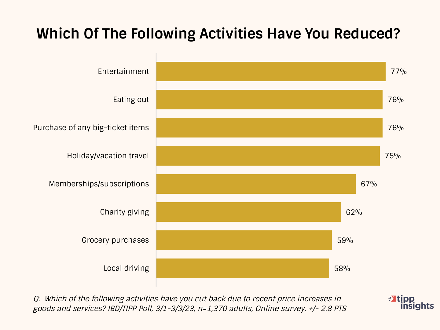 Most Americans are spending less. They are cutting back on entertainment (77%), eating out (76%), purchasing big-ticket items (76%), holiday/vacation travel (75%), and memberships/subscriptions (67%).