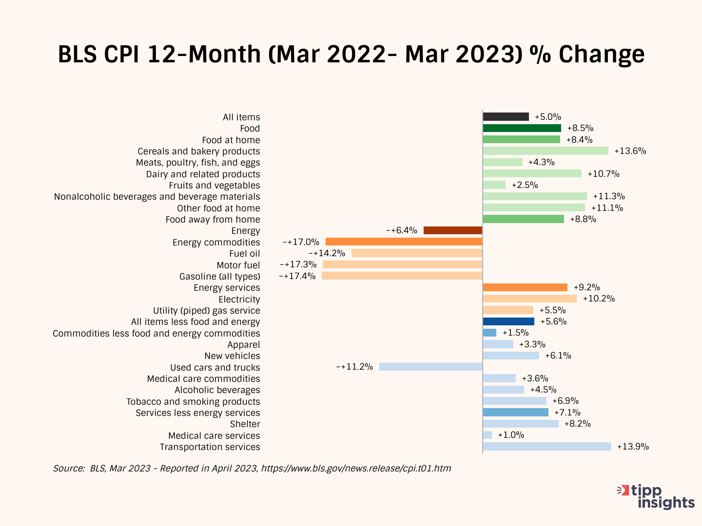 The Consumer Price Index (CPI) released by the government on Wednesday showed a 5.0% year-over-year increase in prices from March 2022 to March 2023, edging down from a rate of 6.0% in February and 6.4% in January. The CPI has declined steadily from a 40-year high of 9.1% in June to 5.0% in March.