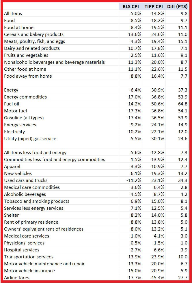 The Core CPI is the price increase for all items, excluding Food and Energy. The Core TIPP CPI was 12.8% compared to 5.6% BLS CPI in the year-over-year measure, a 7.3-point difference.