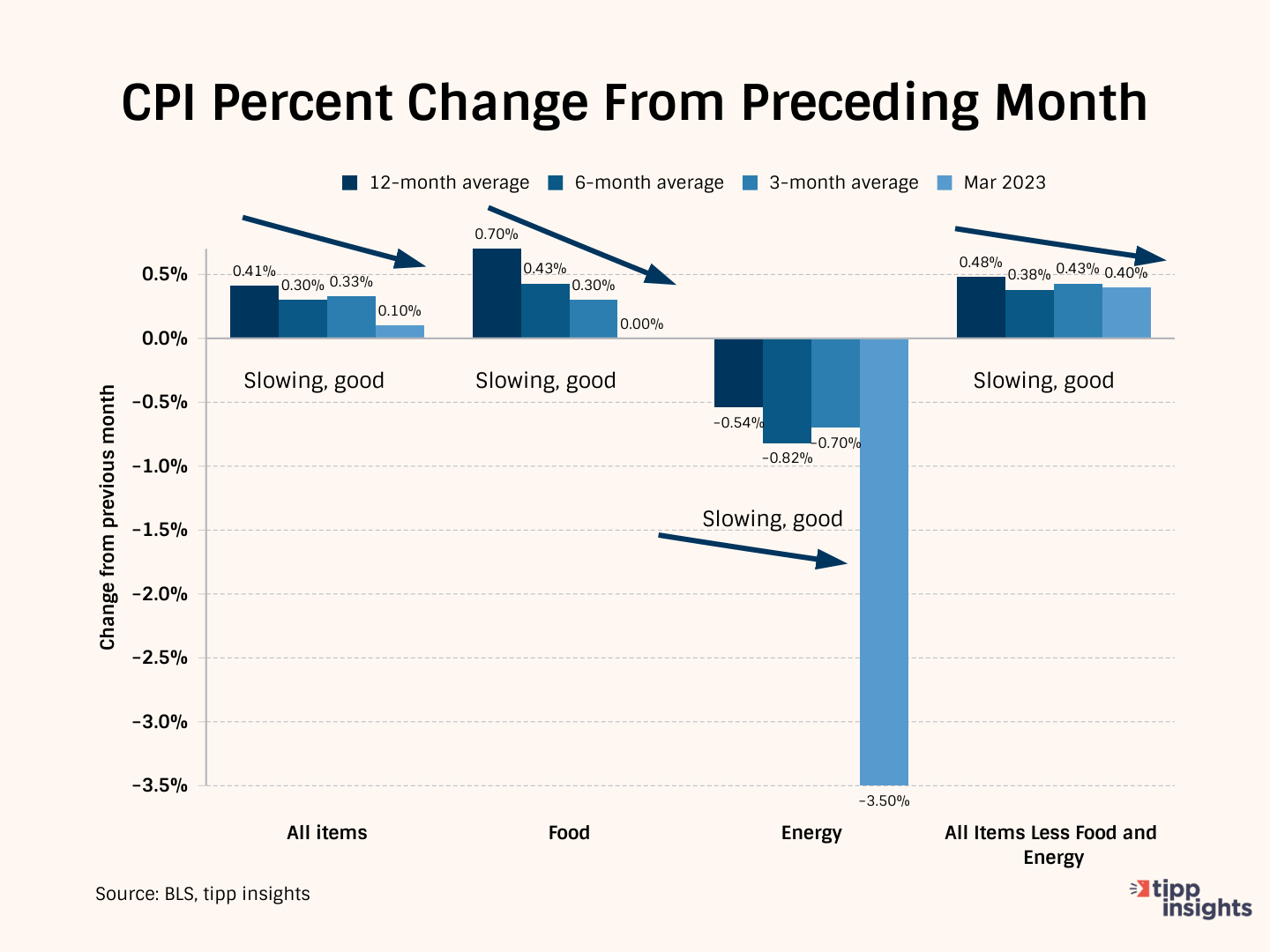 For "all items less food and energy," the March reading of 0.40% is lesser than the three-month average of 0.43%, indicating improvement relative to the past three months. However, the 3-month average of 0.43% is greater than the 6-month average of 0.38% showing inflation pickup.