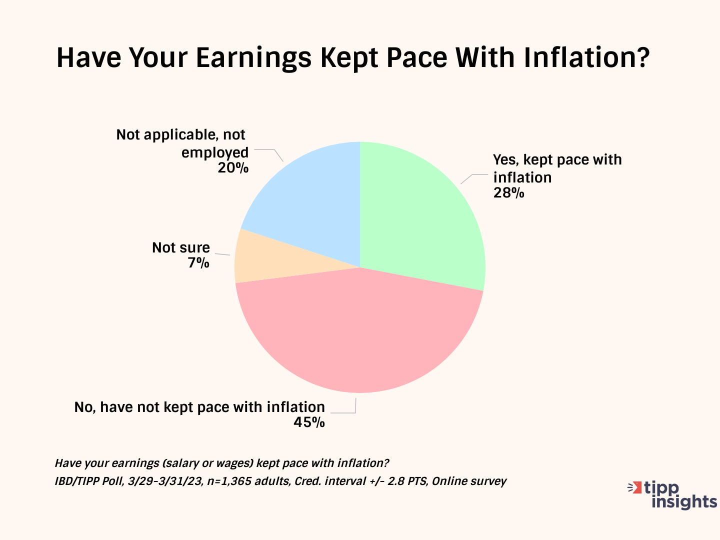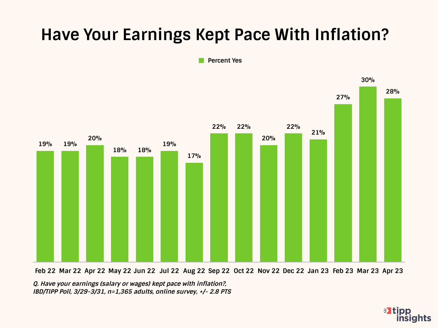Over two in five ( 45%, 44% in March) say their wages have not kept pace with inflation. Only 28% (30% in March) say their income has kept pace with inflation. This statistic hovered in the low twenties for most of the last year. The positive change in the recent three months may denote the start of a new trend.