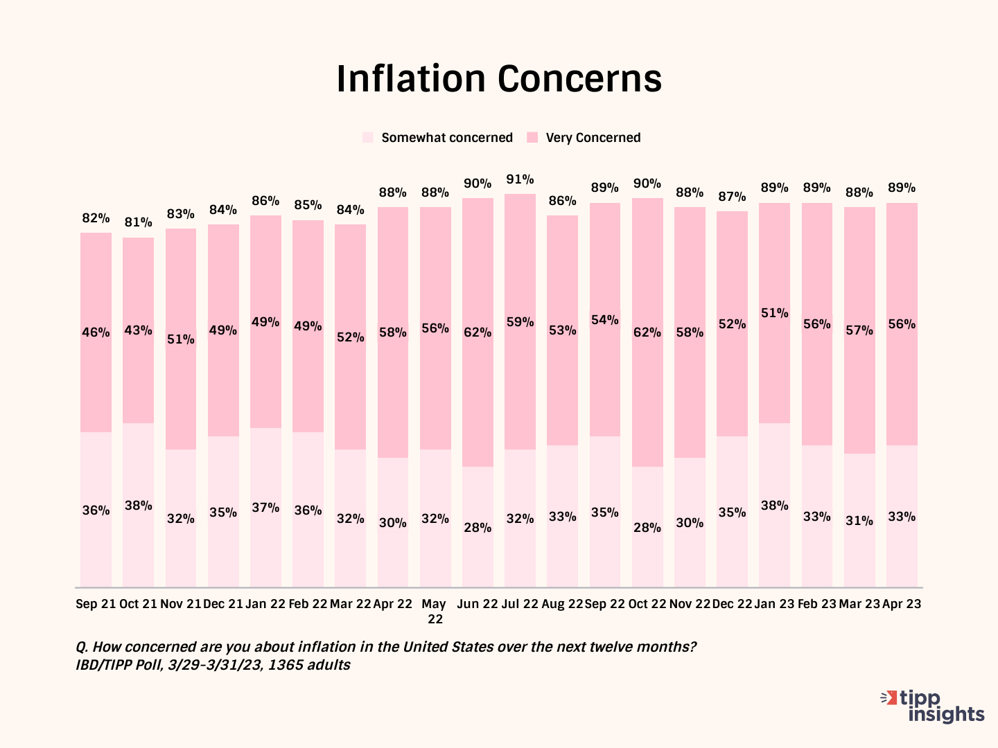 The latest Investor's Business Daily/TIPP Poll, completed earlier this month, shows that nine in ten (89%; 88% in March) survey respondents are concerned about inflation. Throughout the past year, inflation concerns have stayed above 80%. The share of "very concerned" has been over 50% for twelve consecutive months.