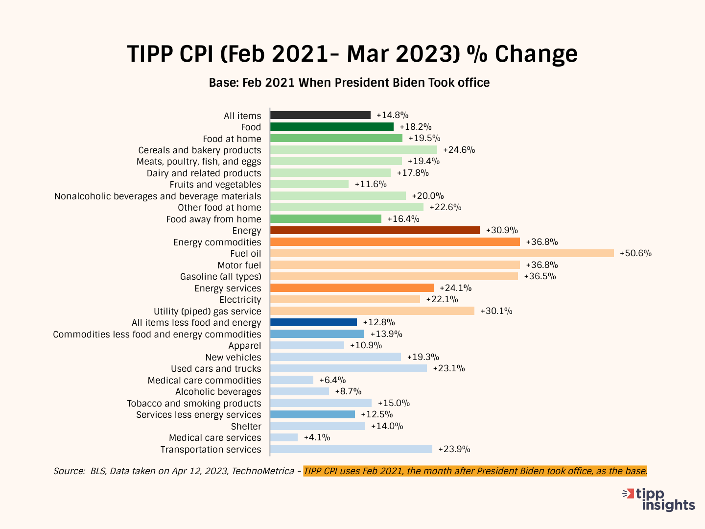 Bidenflation, measured by TIPP CPI using the same underlying data, stood at 14.8% in March. It was 14.4% in February, 13.7% in January, and 12.8% in December.