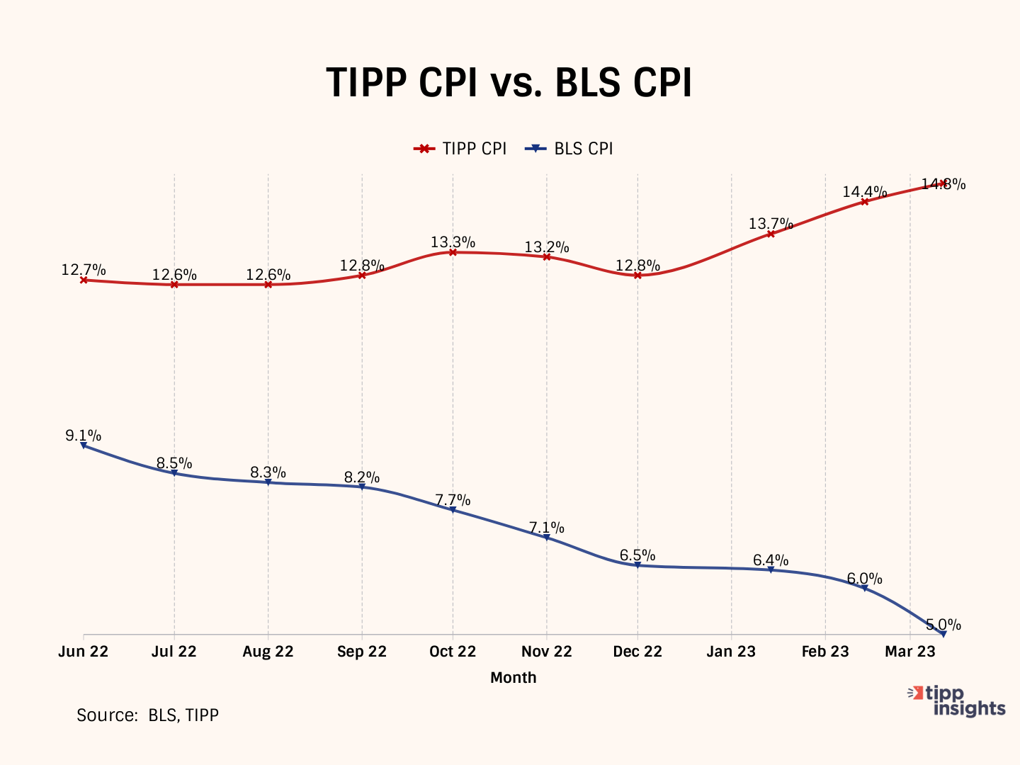 The annual CPI increase reported by BLS is 5.0% for March 2023. Compare this to the TIPP CPI of 14.8%, a 9.8-point difference. Prices have increased by 14.8% since President Biden took office. On an annualized basis, TIPP CPI is 6.83%.