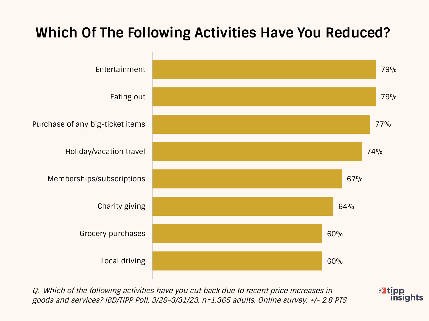 As a result of inflation, Americans are cutting back on household spending - cutting back on entertainment (79%), eating out (79%), purchasing big-ticket items (77%), holiday/vacation travel (74%), and memberships/subscriptions (67%). Many (64%) are cutting back on even good causes such as charity giving. Nearly three out of every five (60%) households spend less on groceries. The high gasoline prices forced 60% to cut back on local driving.