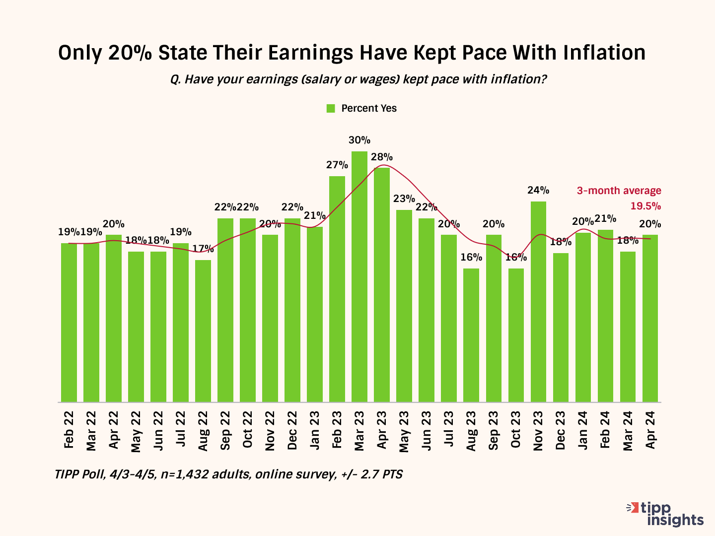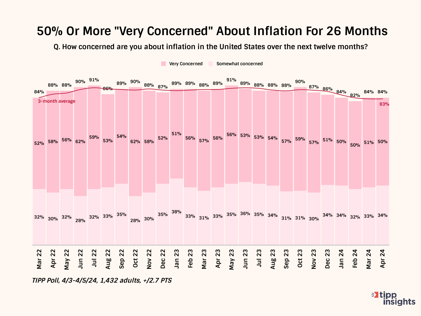 The latest TIPP Poll, completed earlier this month, shows over eight in ten (84%) survey respondents are concerned about inflation. Since January 2022, inflation concerns have stayed above 80%. The "very concerned" share has been at least 50% since March 2022, i.e., for the past twenty-six months.
