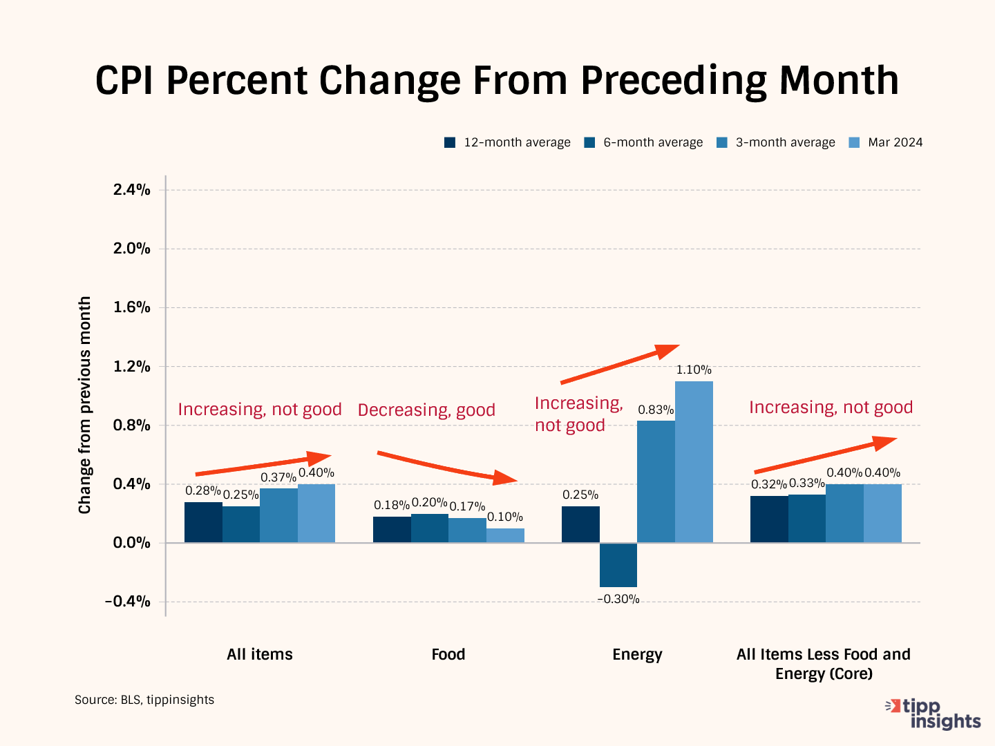 Typically, we compare the data from March 2024 to the three-month average to gain a clearer perspective. In March 2024, the price increase for All items was 0.40%, bigger than the three-month average of 0.37%. This shows a significant deterioration in March.