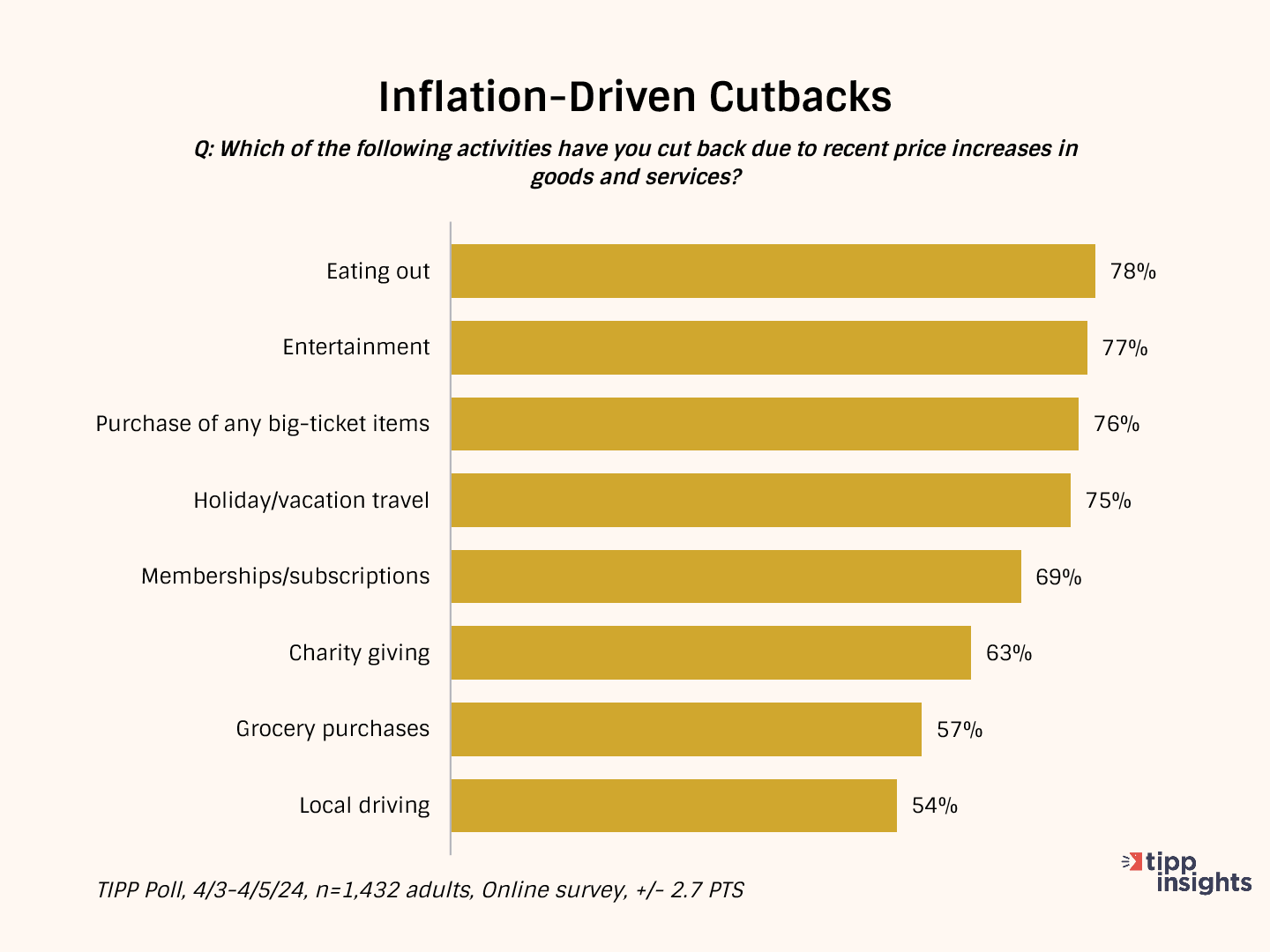 They are cutting back on eating out (78%), entertainment (77%), purchasing big-ticket items (76%), holiday/vacation travel (75%), and memberships/subscriptions (69%).