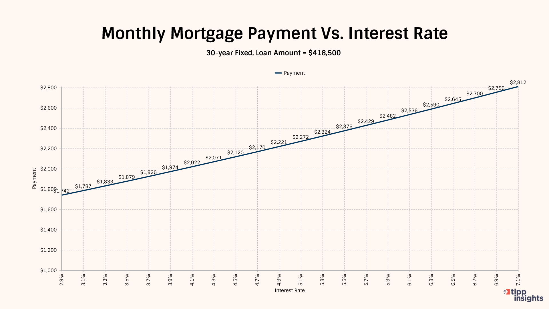 We chart below how rising mortgage rates have affected the average American household. The average home price in America is about $465,000. Assuming that a family makes a downpayment of 10%, they would borrow $418,500 over 30 years. Of course, the interest rates remain fixed, but the monthly set-aside for mortgage payments increases steadily with each new family aspiring to own a home. This set aside does not include other homeowner costs, like home insurance rates, which are steadily rising, maintenance, and real estate taxes, which are rising too.