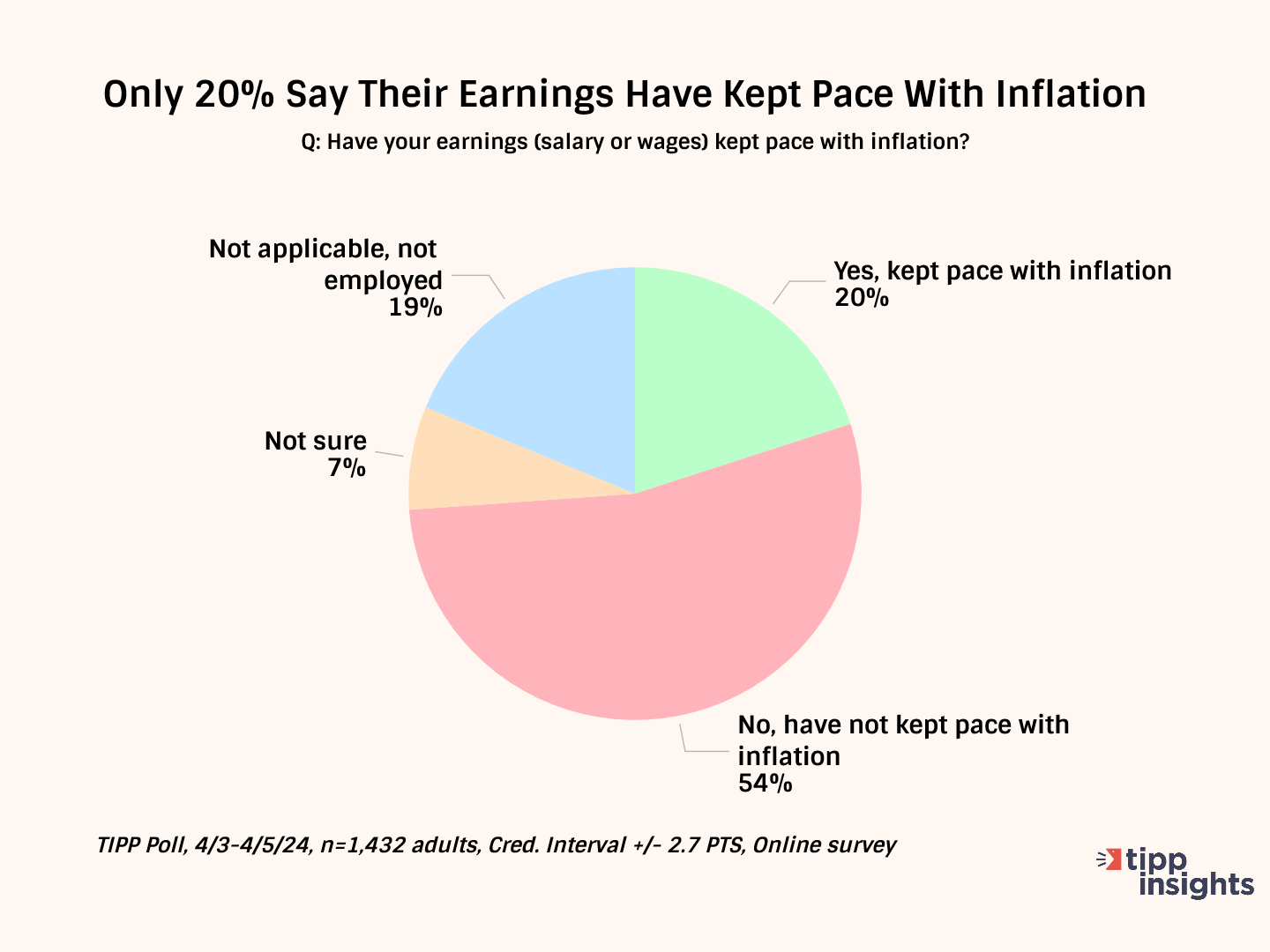 Over half (54%) say their wages have not kept up with inflation, while only one in five (20%) say their income has. Since December 2023, this statistic has moved in the tight 18% to 21% range. Its three-month average is 19.5%.