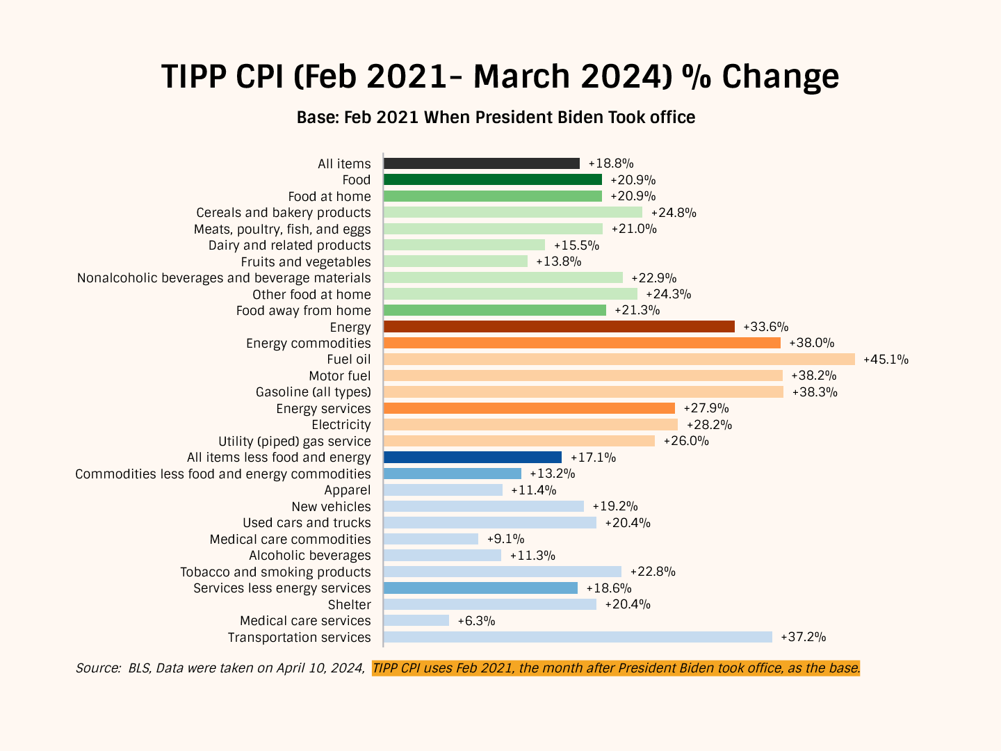 We developed the TIPP CPI, a metric that uses February 2021, the month after President Biden's inauguration, as its base to measure the rate of change. All TIPP CPI measures are anchored to the base month of February 2021, making it exclusive to the economy under President Biden's watch.