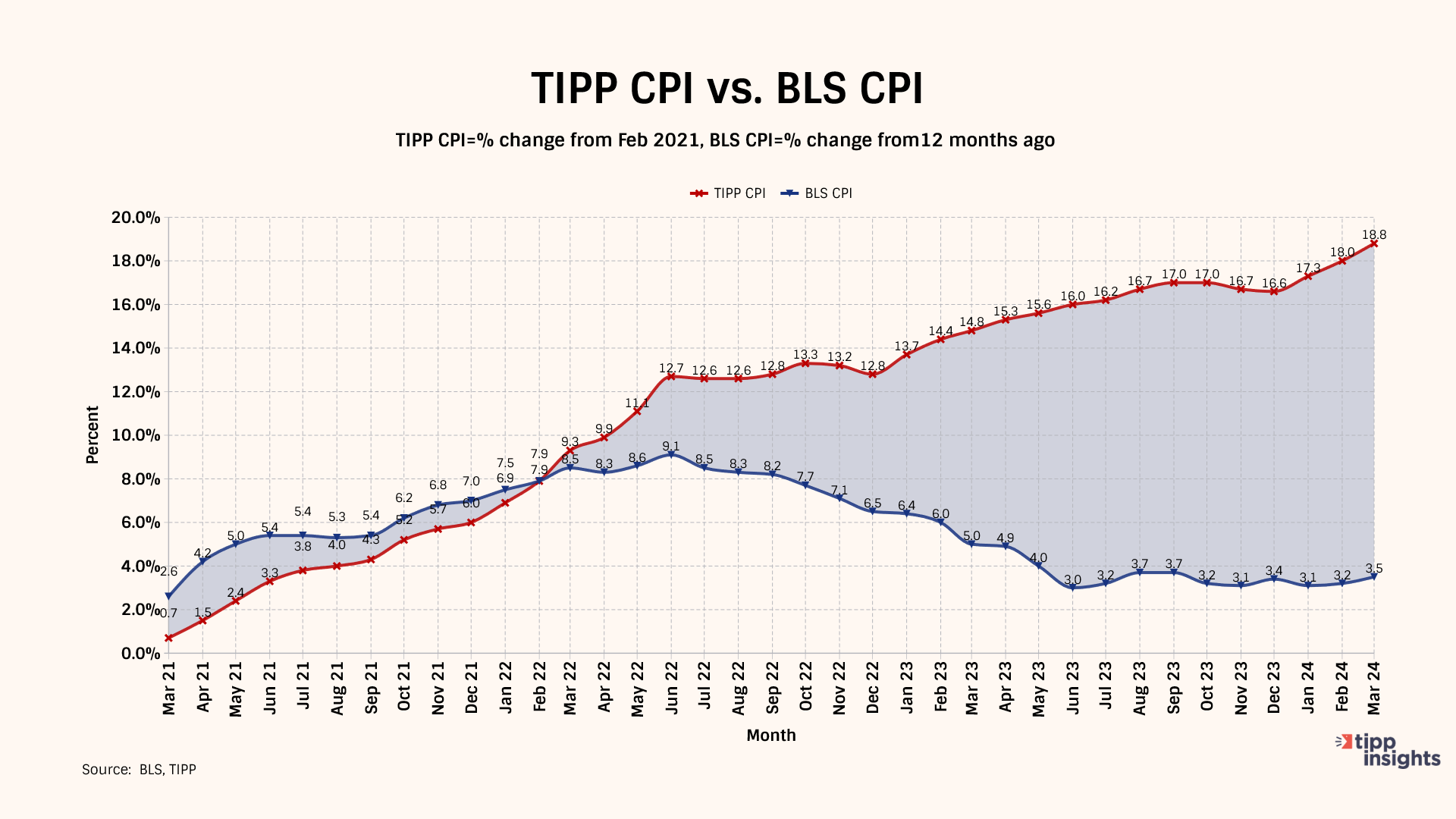 For March 2024, the BLS reported a 3.5% annual CPI increase. Compare this to the TIPP CPI of 18.8% - a 15.3-point difference. Prices have increased by 18.8% since President Biden took office. On an annual basis, TIPP CPI is 6.0%.