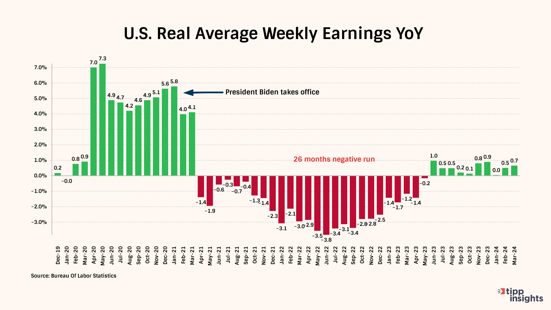 Real weekly wages, measured year-over-year, showed negative readings for 26 out of the 38 months during the Biden presidency from February 2021 to March 2024. The 26-month negative streak was broken in June. The measure has posted positive readings for nine months, from July 2023 and March 2024.