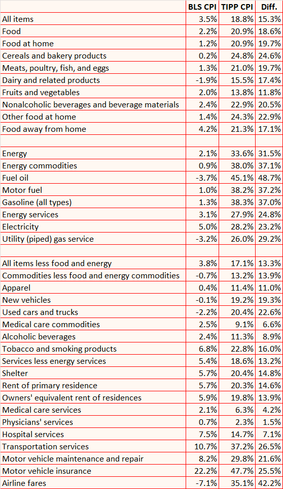 TIPP CPI data show that Energy prices increased by 33.6%. But, according to the BLS CPI, energy prices rose by 2.1%. The difference between the two is a whopping 31.5 points.