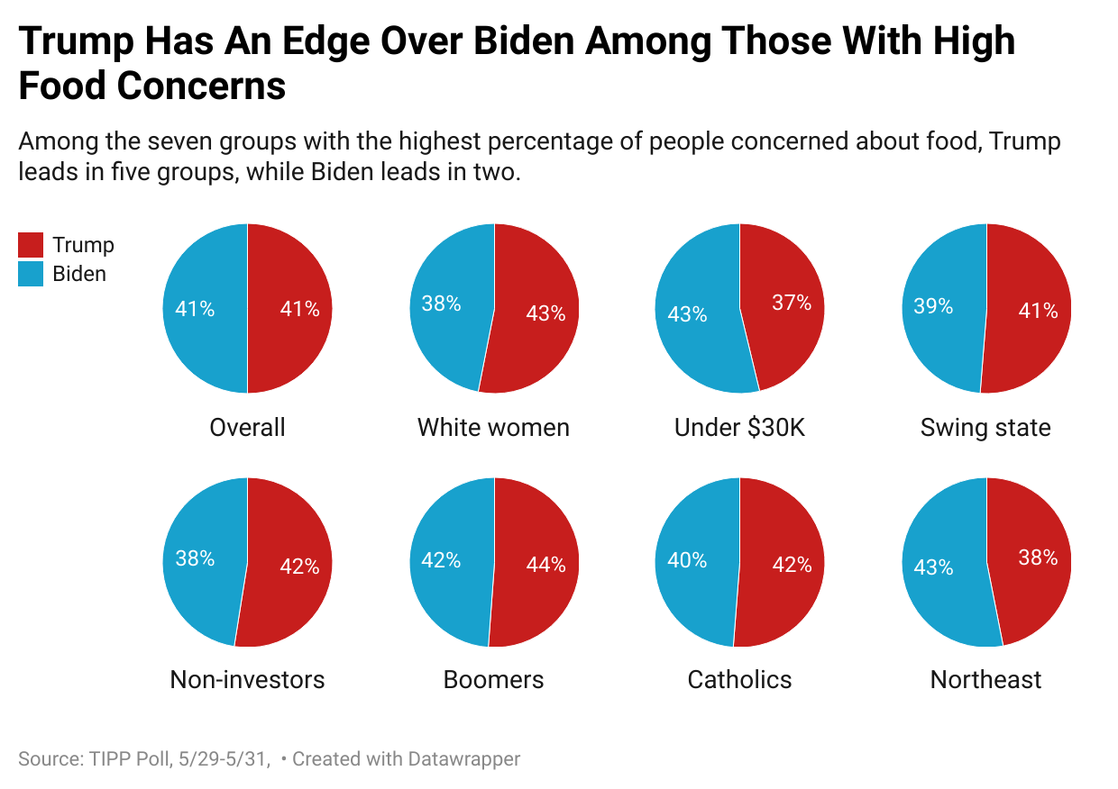 To answer that question, we looked at the presidential preferences of these groups. Of the seven groups with high food concerns, Trump leads in five, while Biden leads in two.