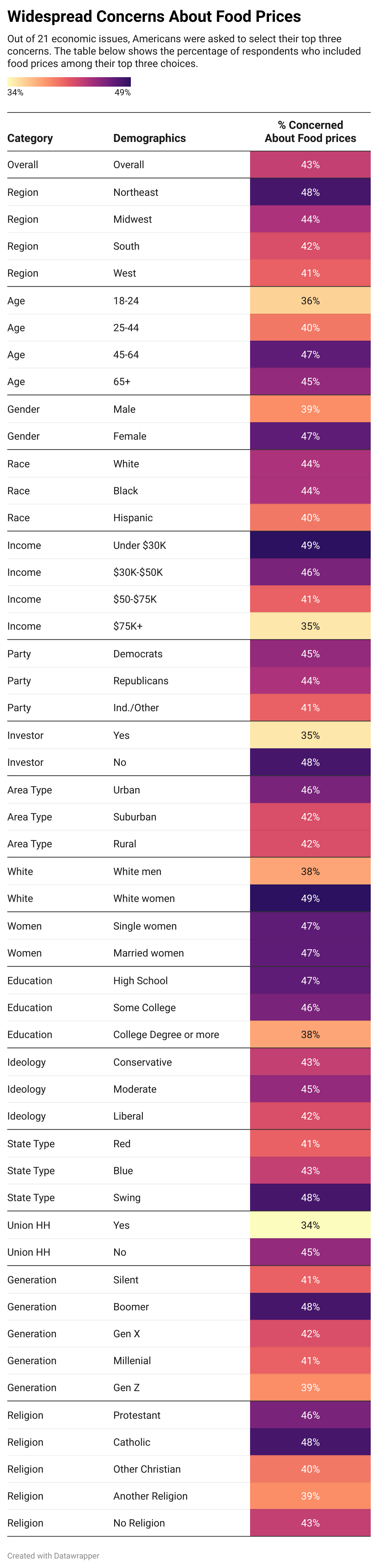 About half, 49%, of Americans with incomes under $30K and white women are concerned about food prices. Five demographics are at the next level of 48%: Northeast, non-investors, swing state residents, baby boomers, and Catholics.