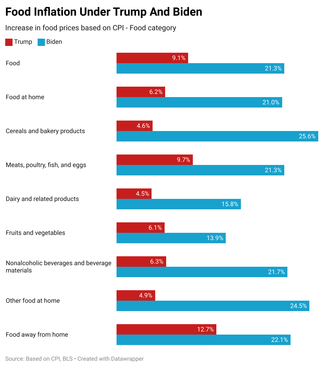 Prices of cereals and bakery products climbed by 4.6% during Trump's term, whereas they surged by 25.6% under Biden's administration.