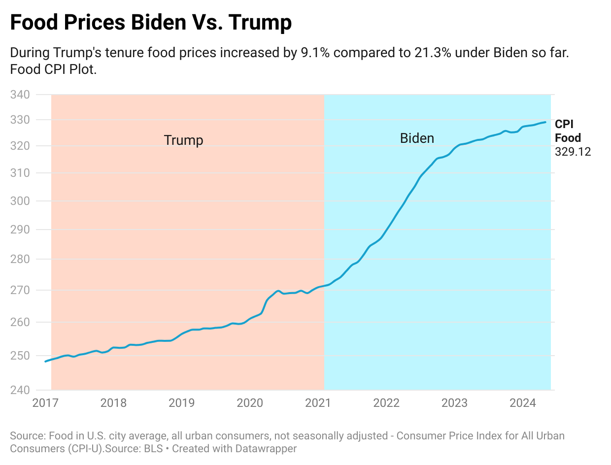 During the previous administration, food prices increased moderately by 9.1%. However, even though President Biden’s tenure ends on January 20 next year, we've already witnessed a staggering surge of 21.3% in food prices. This stark contrast is not just a statistic; it's a reality reflected in every household budget, making it harder for families to put food on the table.