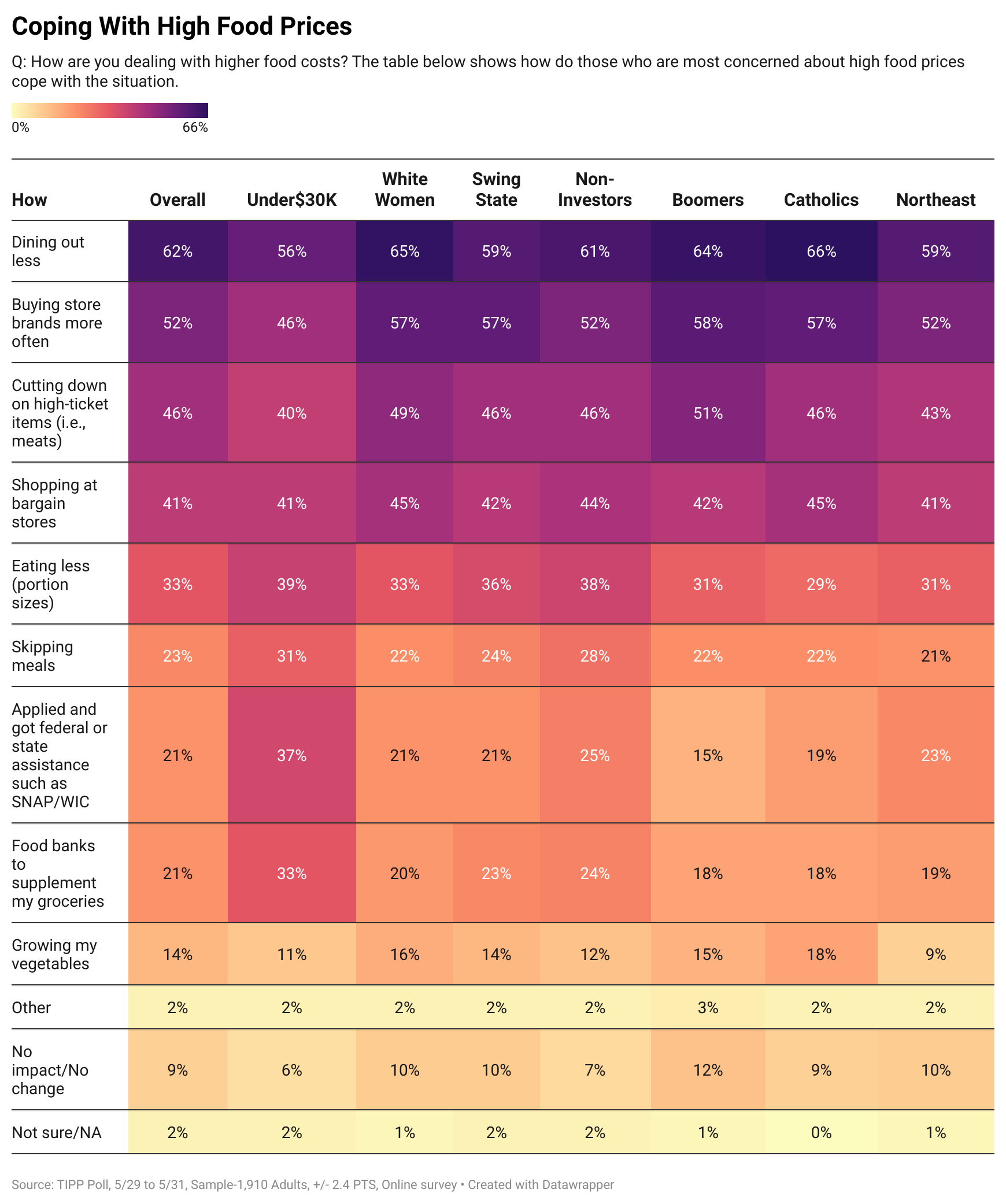 Each month, the TIPP poll asks Americans: How are you dealing with higher food costs? We present 12 answer choices and let respondents pick all that apply to them.