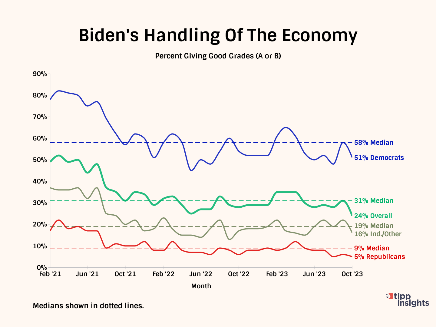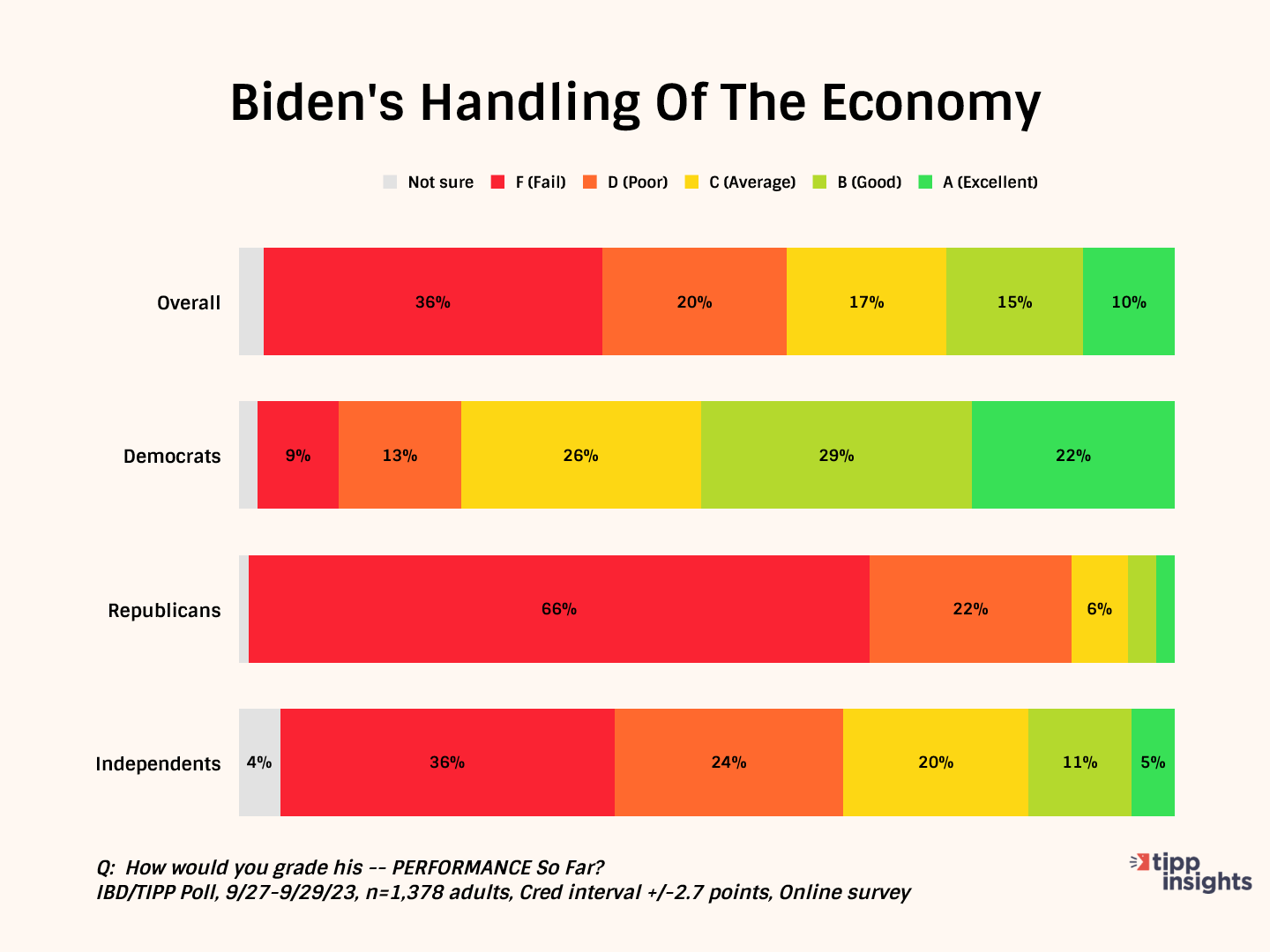 In our latest poll, most Americans (56%) give Biden a failing grade (D or F) regarding his handling of the economy. Only 25% give him an A or B.